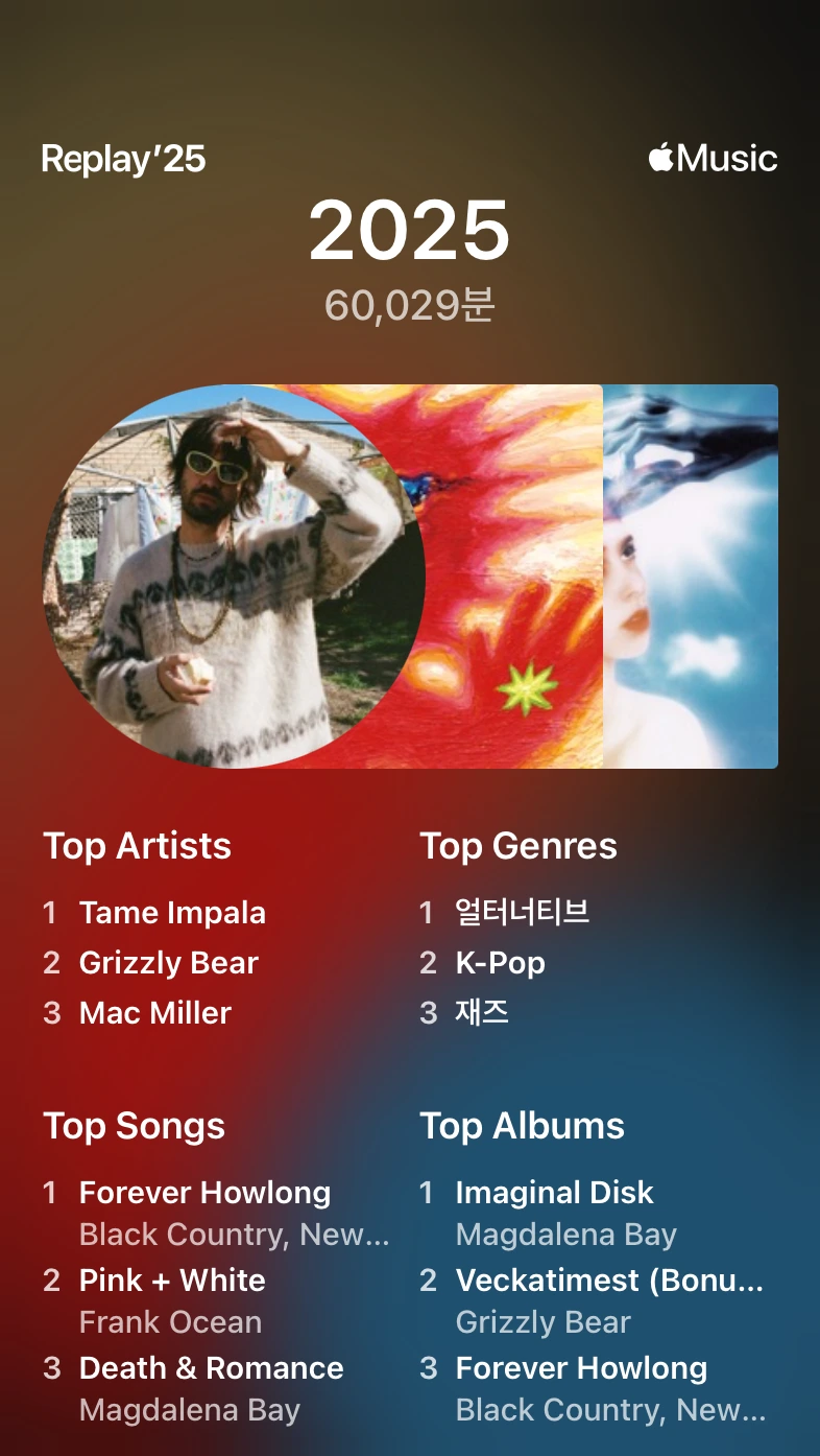 올해를 기준으로 지금까지 총 6만분동안 애플뮤직을 애용했네요. 시간으로 따지자면 1,000시간이고, 일로 따지자면 41.7일입니다. 가장 많이 들은 아티스트는 Tame Impala, 가장 많이 들은 트랙은 브런치에도 소개한 적이 있는 Forever Howlong입니다. 아직도 소개하지 못한 Grizzly Bear가 올해 두 번째로 많이 들은 아티스트이자 올해 두 번째로 많이 들은 앨범으로 기록돼 있습니다. 부지런해야겠다는 생각이 드네요. 어디까지나 브런치를 개인적인 감상 저장고로 여기는 만큼 (그렇기에 읽어주시는 분들에게는 항상 감사한 마음입니다), 올해가 가기 전에 더 언급하고 싶은 아티스트나 앨범들이 자꾸 눈에 밟힙니다.