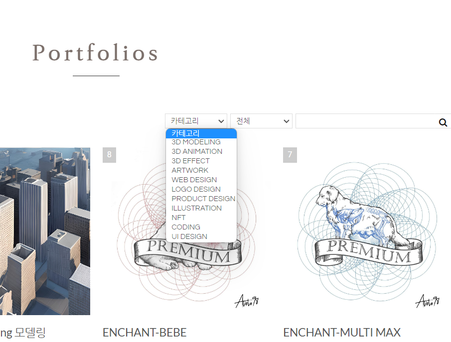 검색창에서 원하는 카테고리를 선택하면 해당 카테고리의 작품들을 손쉽게 확인할 수 있어, 사용자들은 자신이 원하는 스타일의 작품을 쉽게 찾아볼 수 있습니다. 이러한 기능들은 작가들과 기업들 간의 연결 고리를 만들어주며, 기업 채용을 원하는 담당자들이 쉽게 원하는 인재를 찾아낼 수 있도록 구축되어 있습니다.