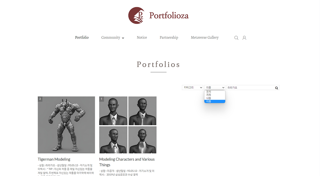 또한 검색창에서 회원가입 당시 가입했던 자신의 이름을 검색하여, 자신이 업로드한 작품들을 한눈에 확인할 수도 있습니다.