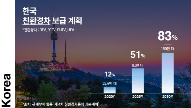 우리나라는 탄소 중립 달성을 위한 대책으로 2030년까지 온실가스 배출량을 2018년 대비 40% 수준으로 줄이는 계획을 세우고 있습니다. 이를 위해 친환경차인 전기차 및 수소전기차를 450만 대 보급하는 계획을 발표했습니다. 이에 따라 2020년 전체 판매 대비 12% 수준이었던 친환경차 판매 비율을 2025년까지는 51%, 2030년까지는 83%로 늘리고, 충전 인프라도 2025년까지 50만 기 이상 구축할 예정입니다. 또한 전기차 부품 소재 국산화와 전용 플랫폼 개발 등을 지원해 전기차 구매의 진입 장벽을 낮출 예정입니다.