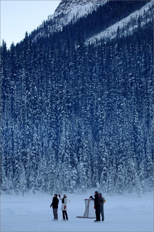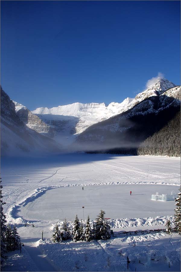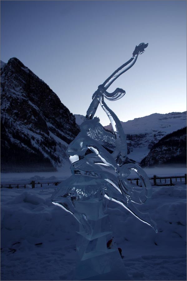 2월초 얼어붙은 레이크 루이스 앞에는 여러 얼음조각 작품들이 전시돼 있었다. 아이스 매직 페스티벌(ICE MAGIC FESTIVAL)에 출품된 작품들이다. 레이크 루이스 안에는 2010 밴쿠버 동계올림픽을 축하하고 기념하는, 얼음으로 만든 오륜과 작은 성이 있었다. 건너편 빅토리아산을 배경으로 얼음조각 작품들에 앵글을 대보니 얼음에 비춰진 은은한 빛이 얼음조각의 음양을 또렷하게 보여준다. 삼삼오오 사람들이 모여들어 작품을 감상한다. 강아지만큼이나 눈과 얼음을 반기는 꼬맹이들은 그 사이를 분주하게 뛰어다니며 놀고 있다.