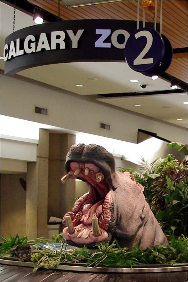 캘거리국제공항(YYC)은 공항 안 디스플레이에 상당히 신경을 써서 여행객들을 지루하지 않게 해준다. 수하물이 나오는 컨베이어 벨트 상단 공간에 캘거리의 역사와 명소에 대한 전시물을 배치했다. 한 눈에 보기에도 꽤 정성을 들인 작업이다. 컨베이어 벨트 위에 자리잡은 캘거리 동물원(Calgary Zoo)의 하마 모형도 이색적인 분위기를 자아낸다.