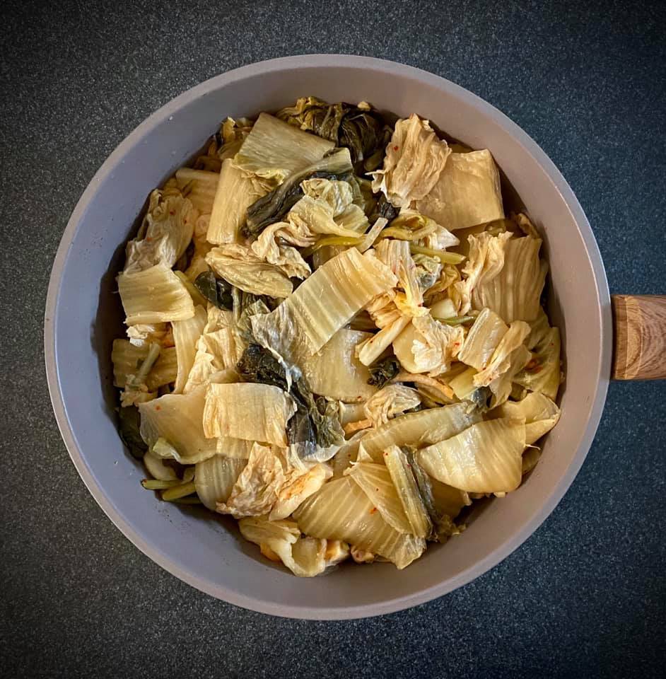 냉장고 안에서 각자 셋방살이 하던 묵은 김치와 열무를 깨끗하게 빨아 한데 모았다. 그리고 들기름으로 살짝 볶은 뒤 멸치와 다시마를 넣고 지지려고 한다. 봄은 이렇게 온다. ^^ #2021_0228