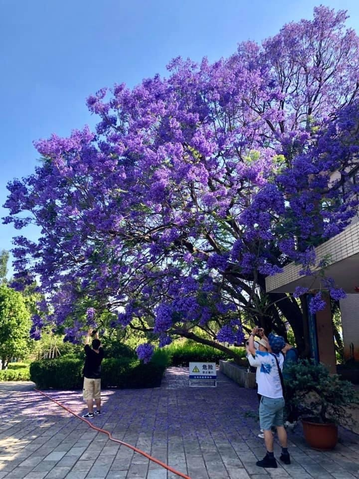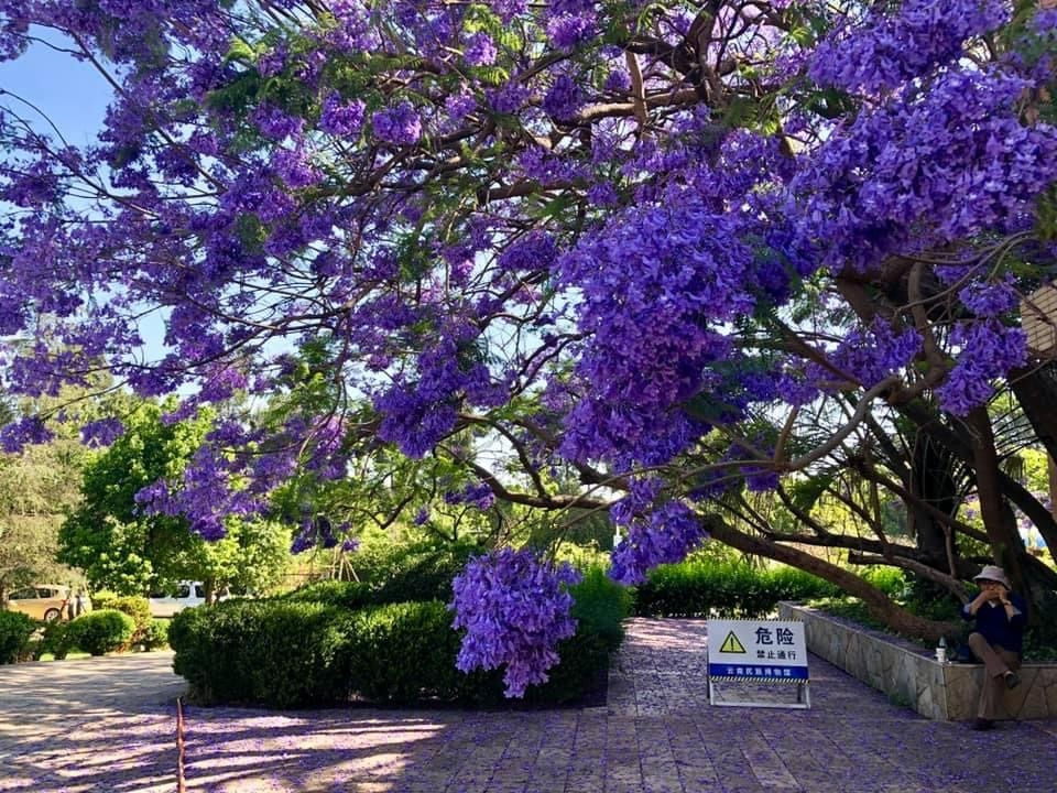 윈난(雲南) 지역에서 흔히 볼 수 있는 나무. 처음엔 라일락인 줄 알았다. '보라색 벚꽃'으로 불리는 '자카란다'. 열대성 나무로 능소화과. 운남민족박물관 앞. #2019_0507