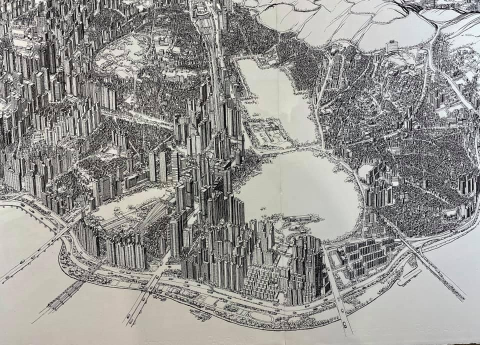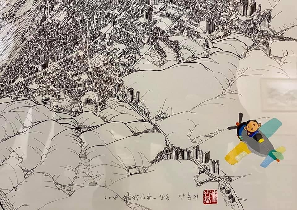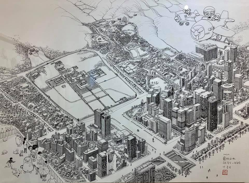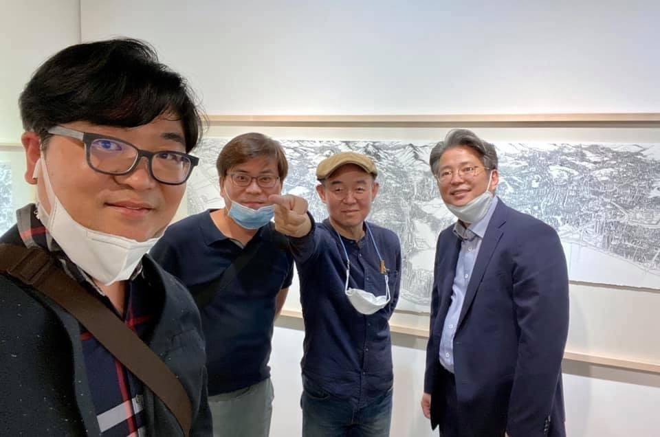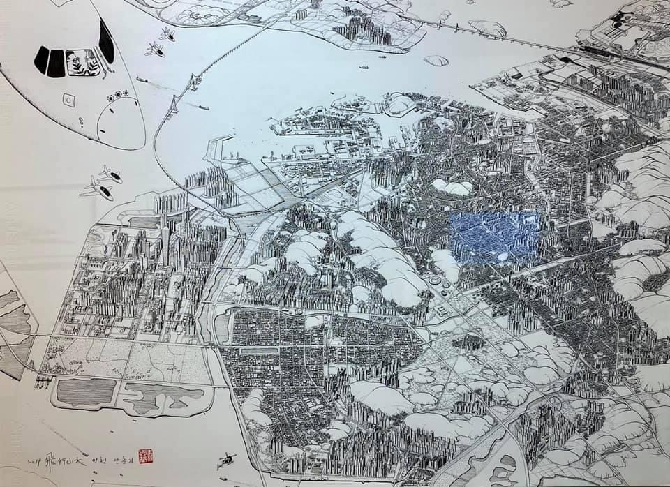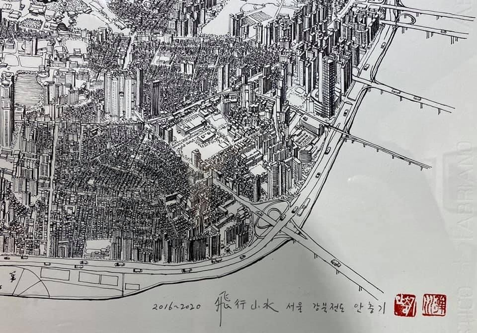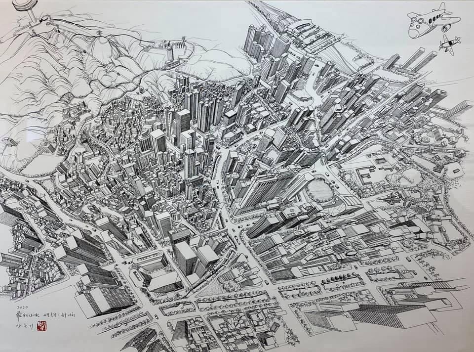 오늘 작품 전시회장에서 만난 그에게 평소 궁금하던 걸 물어봤다. 한 도시를 '부감'으로 그려내려면 단순한 기억만으로는 불가능할텐데 어떻게 그리냐고. 항공사진이건 자료사진이건 모을 수 있는 관련(사진)자료를 최대한 다 모은단다. 그렇게 해도 막상 그림을 그리면 '빈 공간'이 생기는데, 그건 (개연성 있는) 작가적 상상과 작품 경험으로 채워낸다고. 사실과 같으면서도 다른, 다르면서도 같은 안충기의 펜화는 그렇게 만들어진다.