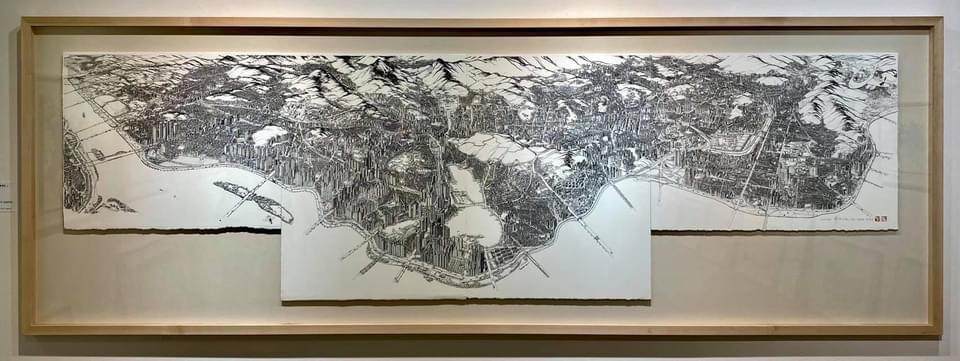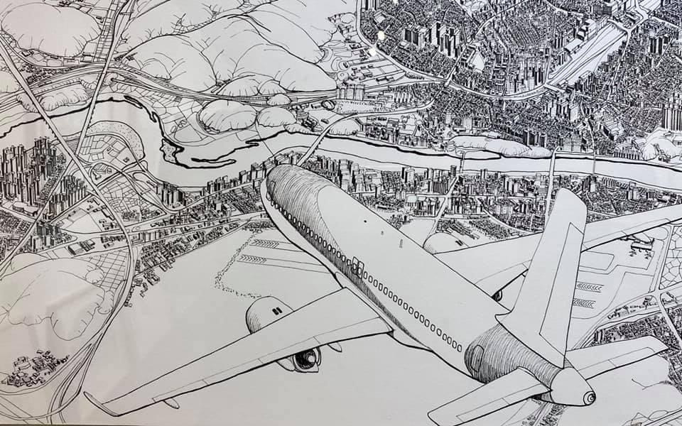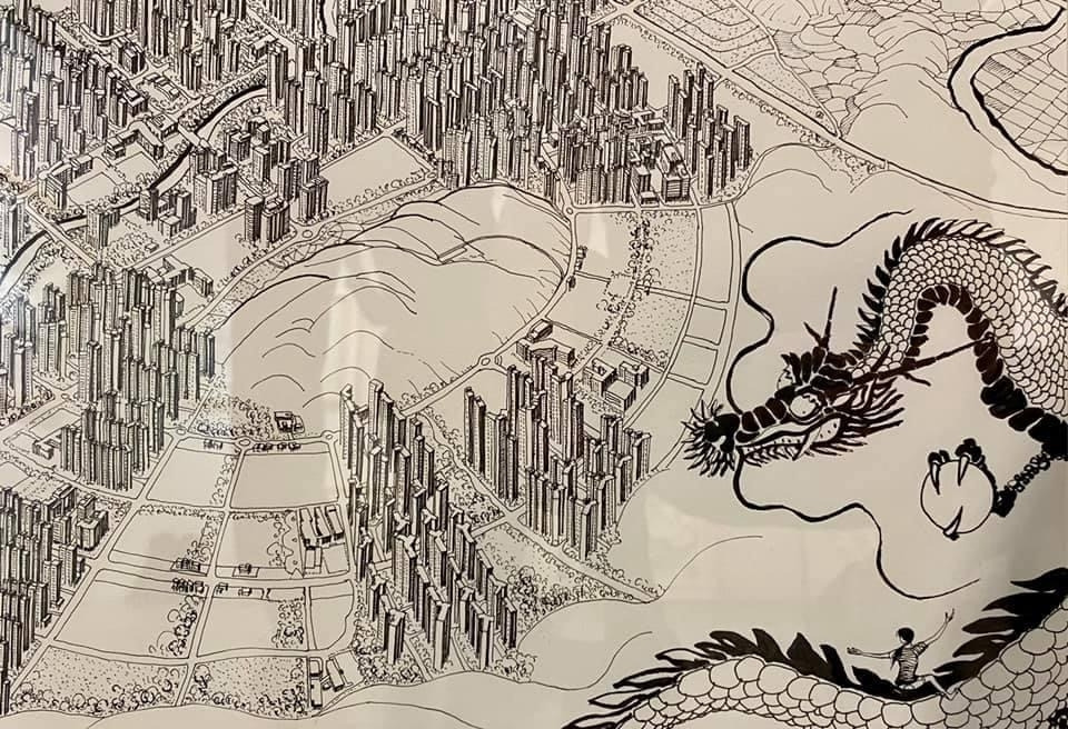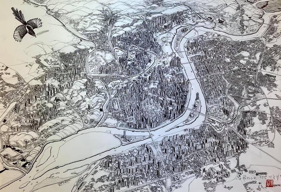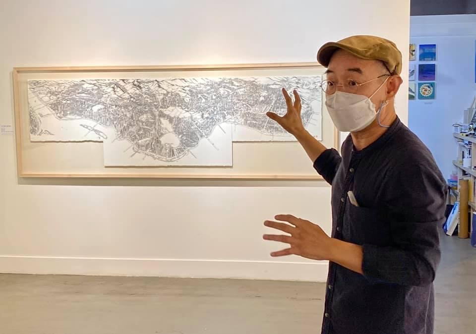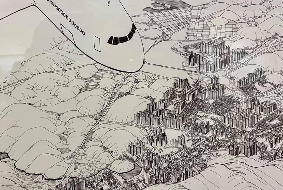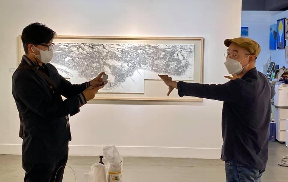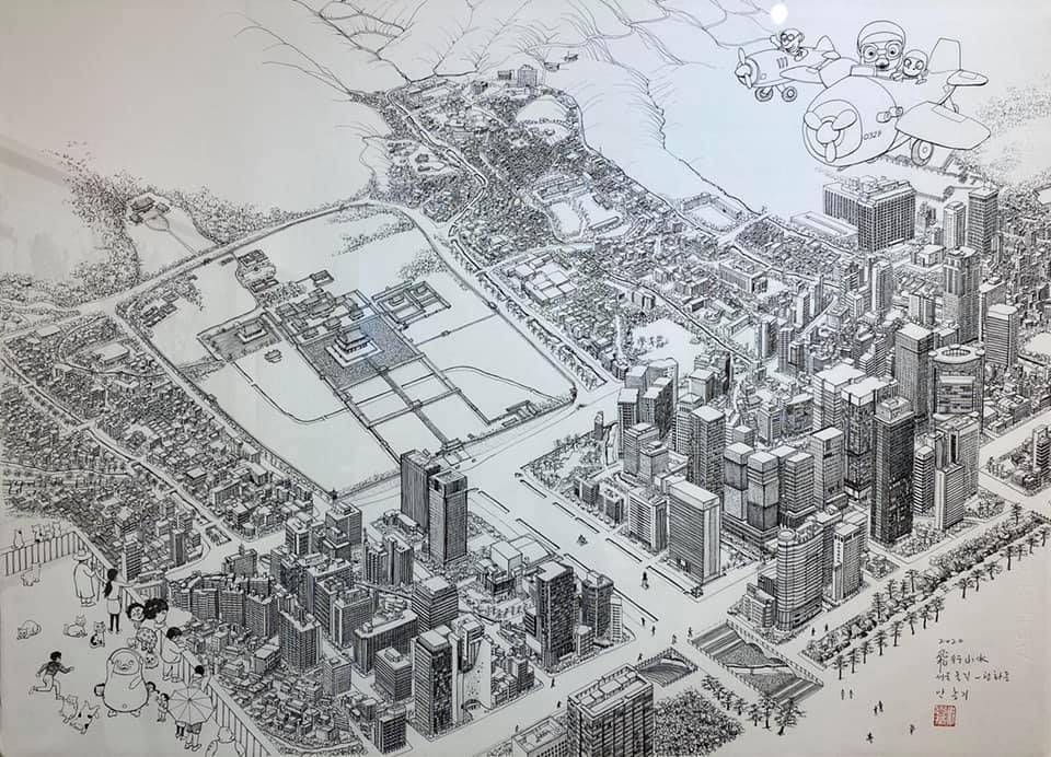 오늘 작품 전시회장에서 만난 그에게 평소 궁금하던 걸 물어봤다. 한 도시를 '부감'으로 그려내려면 단순한 기억만으로는 불가능할텐데 어떻게 그리냐고. 항공사진이건 자료사진이건 모을 수 있는 관련(사진)자료를 최대한 다 모은단다. 그렇게 해도 막상 그림을 그리면 '빈 공간'이 생기는데, 그건 (개연성 있는) 작가적 상상과 작품 경험으로 채워낸다고. 사실과 같으면서도 다른, 다르면서도 같은 안충기의 펜화는 그렇게 만들어진다.