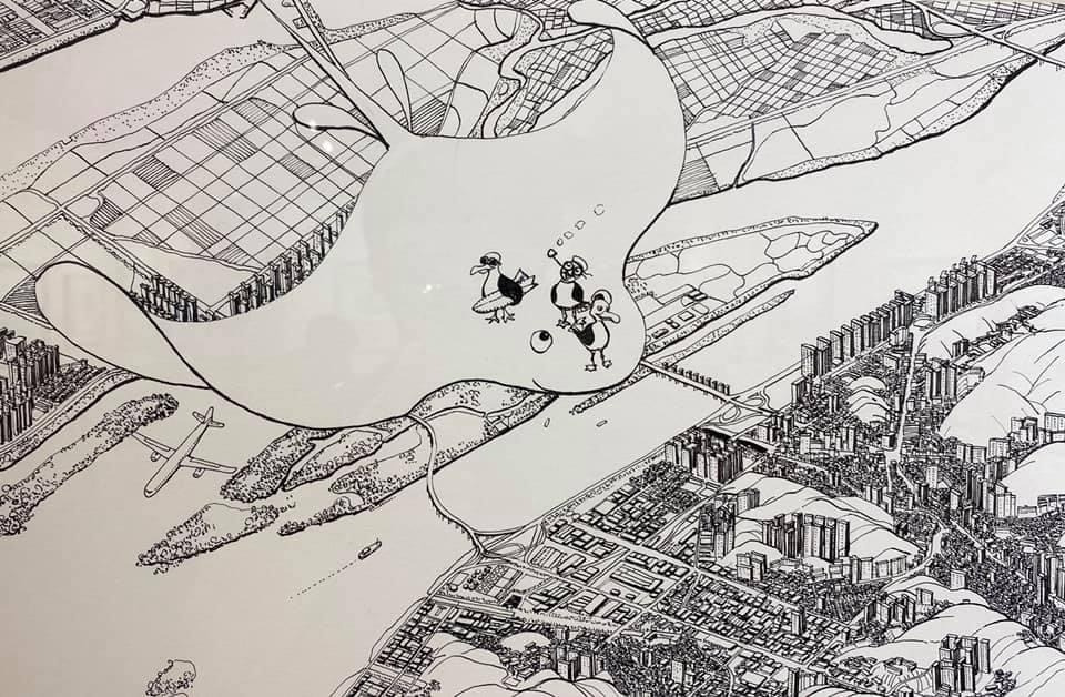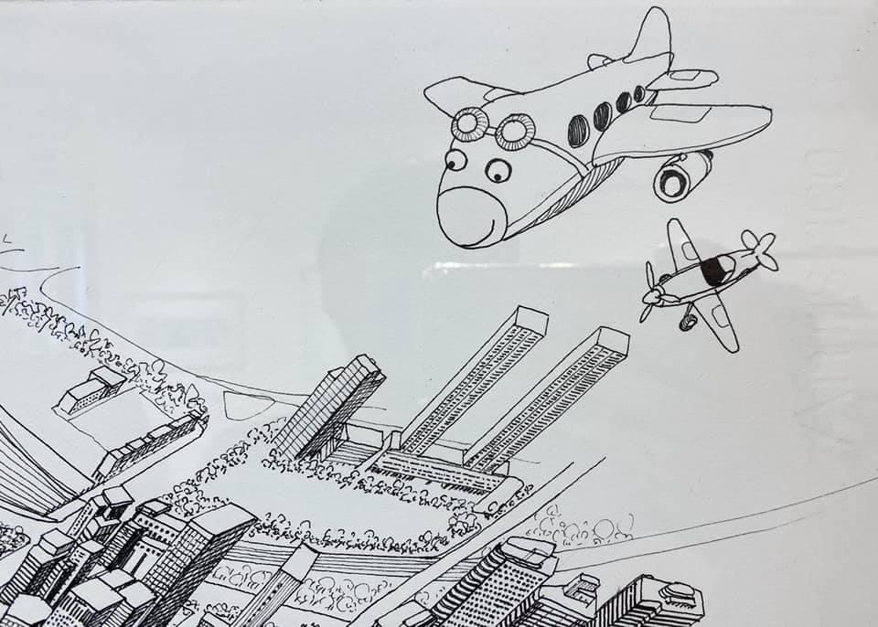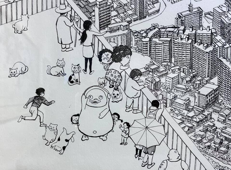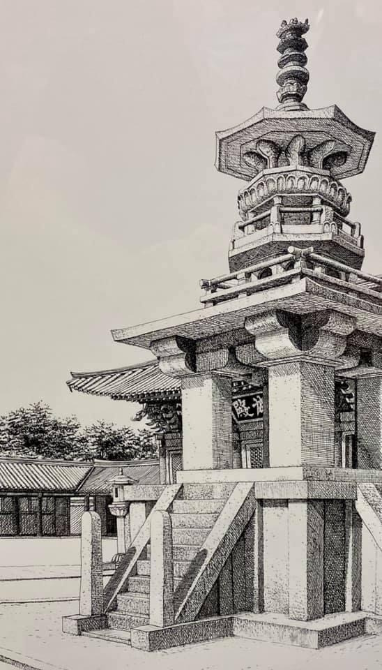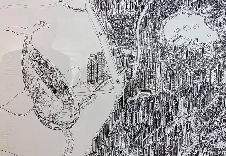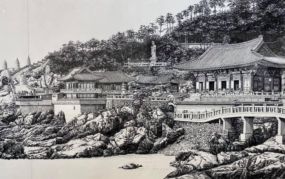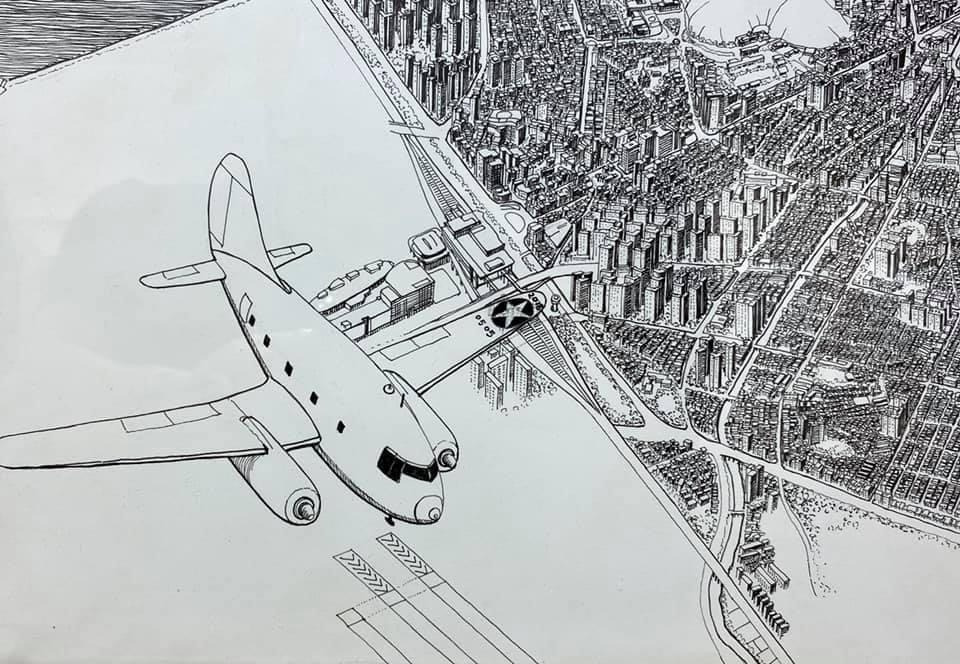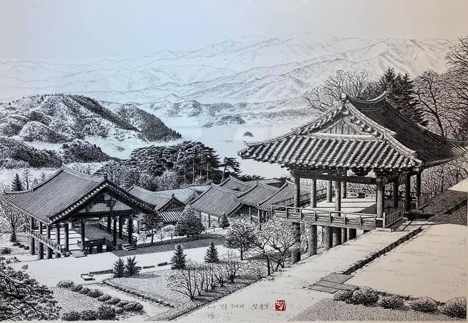 오늘 작품 전시회장에서 만난 그에게 평소 궁금하던 걸 물어봤다. 한 도시를 '부감'으로 그려내려면 단순한 기억만으로는 불가능할텐데 어떻게 그리냐고. 항공사진이건 자료사진이건 모을 수 있는 관련(사진)자료를 최대한 다 모은단다. 그렇게 해도 막상 그림을 그리면 '빈 공간'이 생기는데, 그건 (개연성 있는) 작가적 상상과 작품 경험으로 채워낸다고. 사실과 같으면서도 다른, 다르면서도 같은 안충기의 펜화는 그렇게 만들어진다.