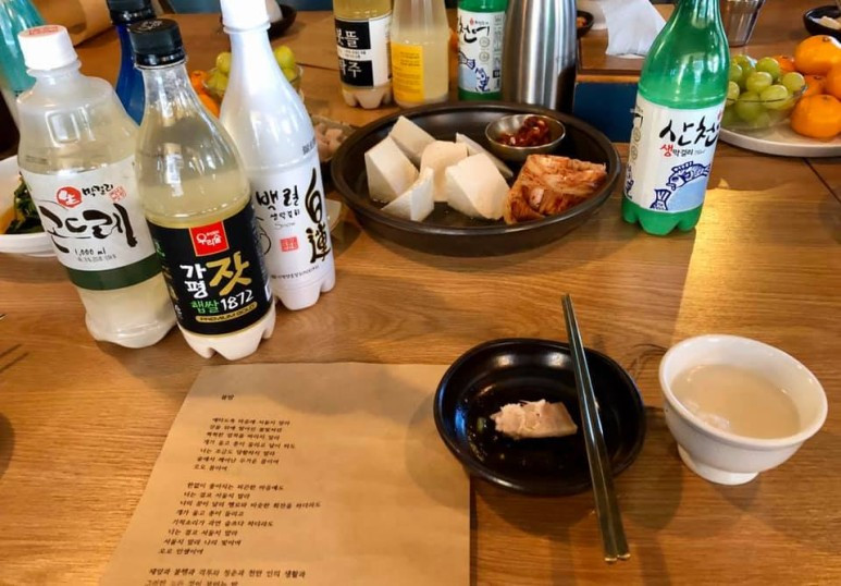 술도 하나씩 나왔다. 산천어생막걸리, 산소막걸리 순수령, 희양산막걸리, 백련막걸리, 가평잣햅쌀1872, 곤드레생막걸리, 호랑이배꼽막걸리, 봇뜰탁주 등 셀 수 없을만큼 다양하게 나왔다. 일인당 회비 1만원으로 이처럼 푸짐하게 술과 안주를 내놓으니, 이것만으로도 주인 입장에선 남는 게 없는 게 아니라 마이너스다.
