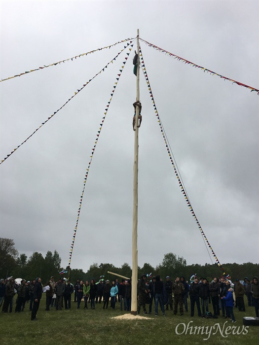 다른 한 켠에서는 활쏘기가 진행됐고, 또 다른 곳에서는 남녀 팔씨름 대회가 열렸다. 통나무 위에 걸터앉아 어깨에 걸쳐멘 자루로 상대방을 쳐서 떨어뜨리는 경기를 보고 있자니, 배개 싸움을 보는 것 같아 피식 웃음이 났다. 빈 자루에 몸을 반쯤 넣고 목표 지점을 돌아오는 아이들 경기도 흥겨웠다. 긴 나무 장대를 세워놓고, 맨몸으로 타고 올라가는 경기도 열렸다. 재미있는 건, 장대 꼭대기에 여러가지 상품을 매달아놓아 목표지점까지 올라간 사람이 상품을 땅에 떨어뜨리면 당사자에게 상으로 주는 경기였다.