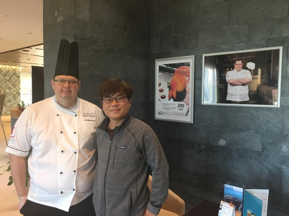 바시키르 수도 우파(Ufa)에 있는 힐튼호텔에서의 첫 아침식사. 셰프와도 한 컷. 당신과 사진 찍고 싶다고 하며 물어보면 대부분 친철하게 설명해준다. 상대방의 기분부터 좋게 해야 말문이 잘 열린다. 뒷편 사진은 6개월 전 자기 모습이라고.