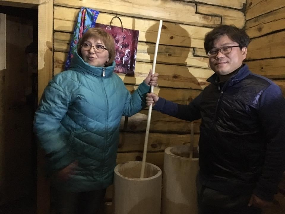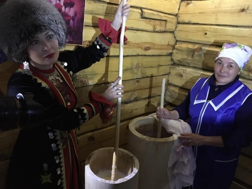 말 농장에서 만드는 바시키리야의 전통주 '꾸믜스'. 마유에 발효종을 넣어 빚는다. 작은 통에 갓 짠 마유와 발효종을 넣고 1시간 동안 젓는다. 긴 막대로 위아래 피스톤 운동을 하면 아래 달린 원형 판자가 액체를 뒤섞어준다.