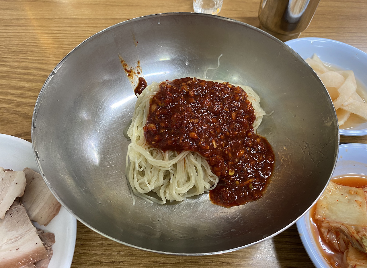 물냉면(1만2000원)을 시켜도 비빔냉면 사리(8000원) 주문이 가능합니다. 친구와 각자 물냉면 한 그릇씩, 그리고 비냉 사리에 제육을 넣어 면 안주를 만듭니다. 그리고 반주. 순식간에 술 한두 병이 사라지는 마술이 펼쳐집니다.