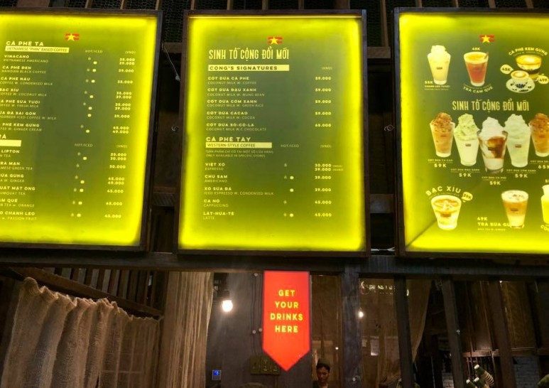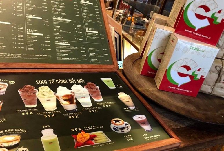 대표 메뉴인 코코넛 스무디 커피를 필두로, 베트남식 연유커피 카페 쓰어다, 과일주스, 베트남 빙수인 쩨(Che), 베트남식 바게트 등의 식사류를 제공하고 있다. 베트남에서 커피가 소비되기 시작한 것은 프랑스 식민지 시대부터다. 이때 심은 커피나무들이 현재의 베트남 커피의 뿌리가 된 셈이다."