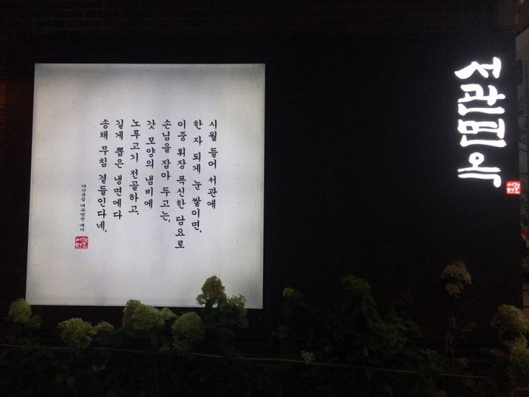 교대역 부근에 문을 연 평양냉면집 <서관면옥>. 가게 건물 오른편에 있는 큰 아크릴 액자에 새겨진 싯구다. 이 시의 주인공은 다산 정약용. 다산문집 <여유당>전에 실려있단다.