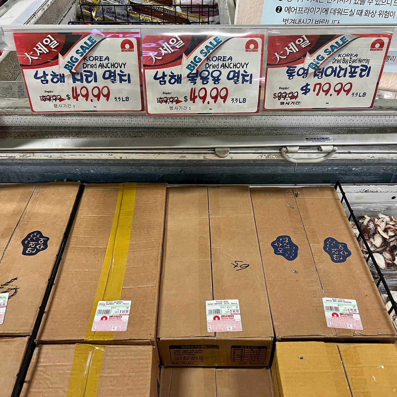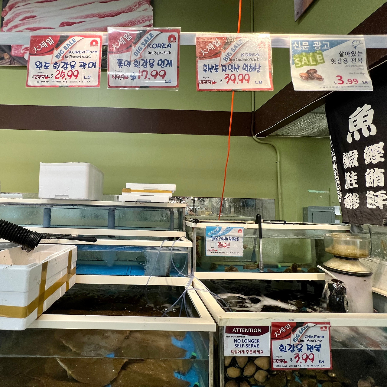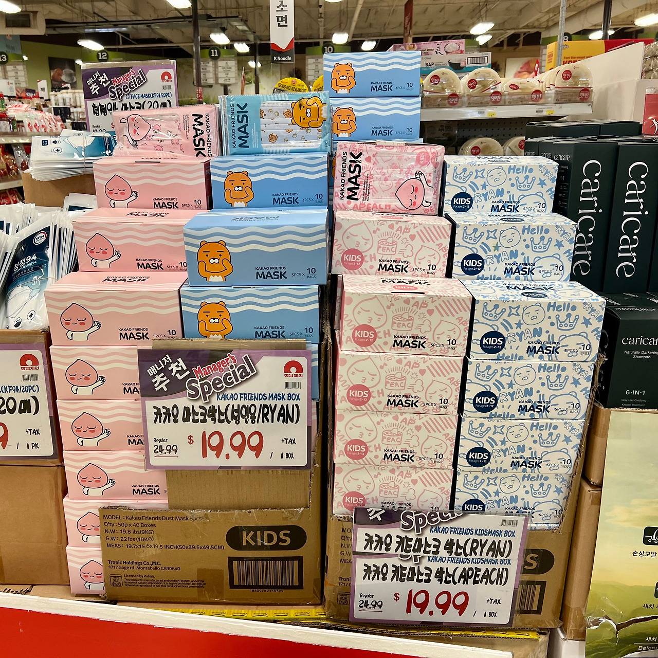 <H Mart>와 더불어 로스앤젤레스의 규모 있는 한인마켓 가운데 하나인 <한남체인>. 완도 광어, 통영 멍게, 흑산도 먹해삼 등 살아있는 한국 해산물을 비행기로 공수해와 LA 한인마트에서 판매한다고. 친한 동생이 만들고 있는 카카오프렌즈의 어피치, 라이언 마스크도 전시·판매되고 있다. #2022_0710