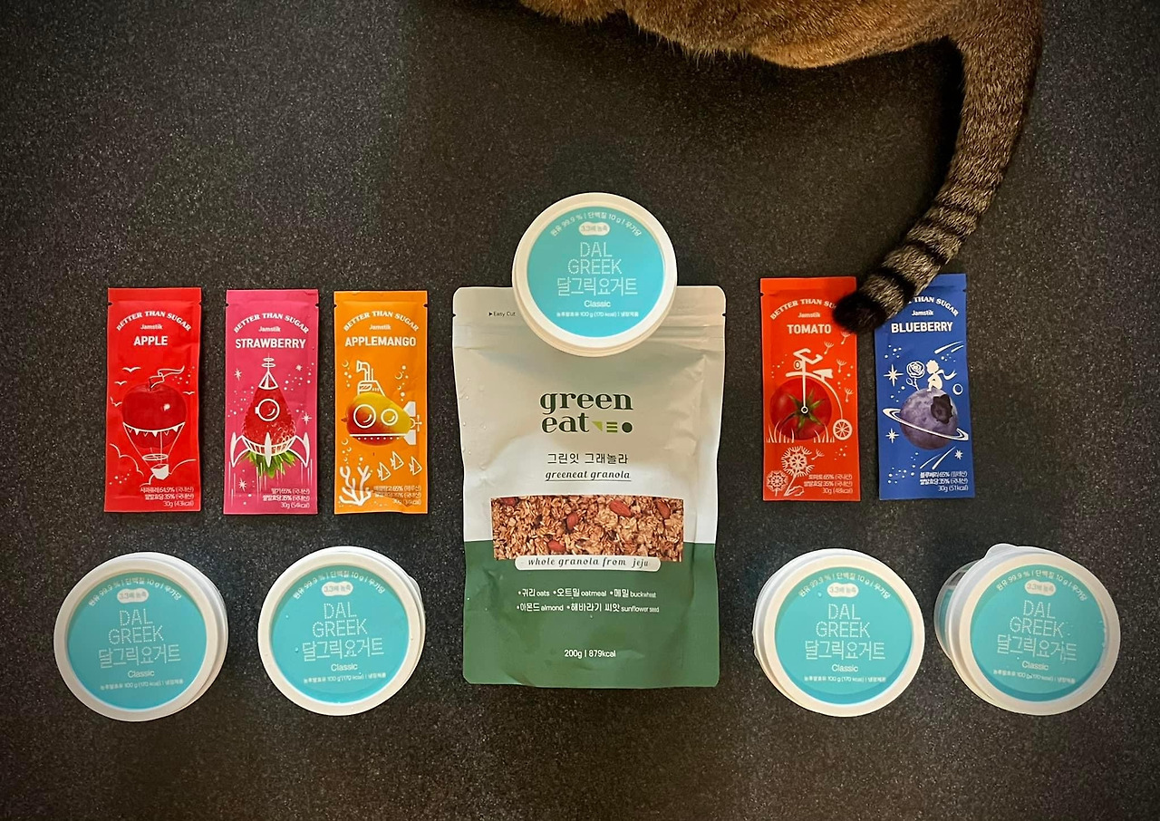 무설탕 과일잼 스틱 5종은 딸기잼, 사과잼, 토마토잼, 애플망고잼, 블루베리잼. 그래놀라는 귀리 크리스피, 귀리, 메밀 볶음, 볶은 아몬드, 해바라기 씨앗, 살 조청, 코코넛 오일, 아가베 시럽 성분으로 구성돼 있다. 고양이가 먼저 찜을 했다. ㅎㅎ