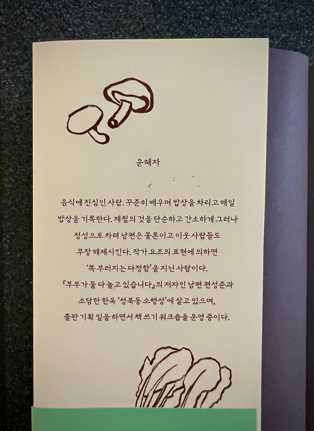 추천사는 윤혜자 작가의 절친인 요조(뮤지션)와 <부부가 둘 다 놀고 있습니다>의 저자이자 남편인 편성준 작가가 썼다. 요조의 추천사 중에는 '똑 부러지는 다정함', '매일이라는 가장 어려운 고비'라는 표현이, 편성준의 추천사 중에는 '그는 손도 오지랖도 넓다'는 말이 눈에 들어왔다. 초→분→시→일→월→년. 점이 선이 되고 면을 만드는 시간의 기록이 1년의 '식사 일기'라는 생각이 들었다.