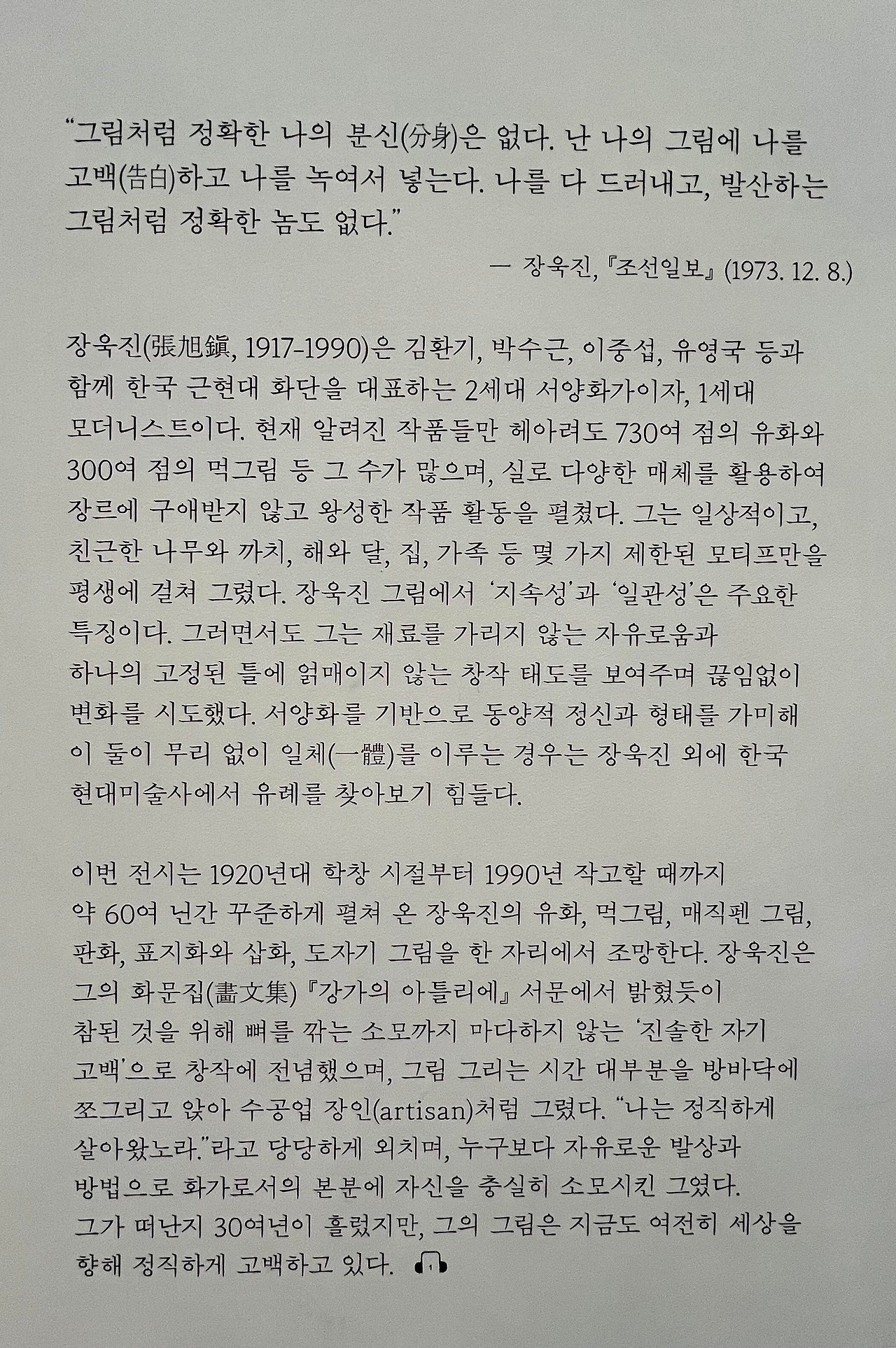 국립현대미술관 덕수궁에서 지난해부터 열렸던 장욱진(張旭鎭, 1917~1990) 회고전 <가장 진지한 고백>이 설 연휴 마지막날인 오늘 막을 내린다. 내 눈에 들어온 몇 가지 것들만 기록삼아 페북에 남긴다. 모든 예술·문학 작품은 작가의 손을 떠나면, 감상과 해석은 오롯이 보는 이의 몫이다. 보는 이 시각의 차이는 틀림이 아니라 다름이다.