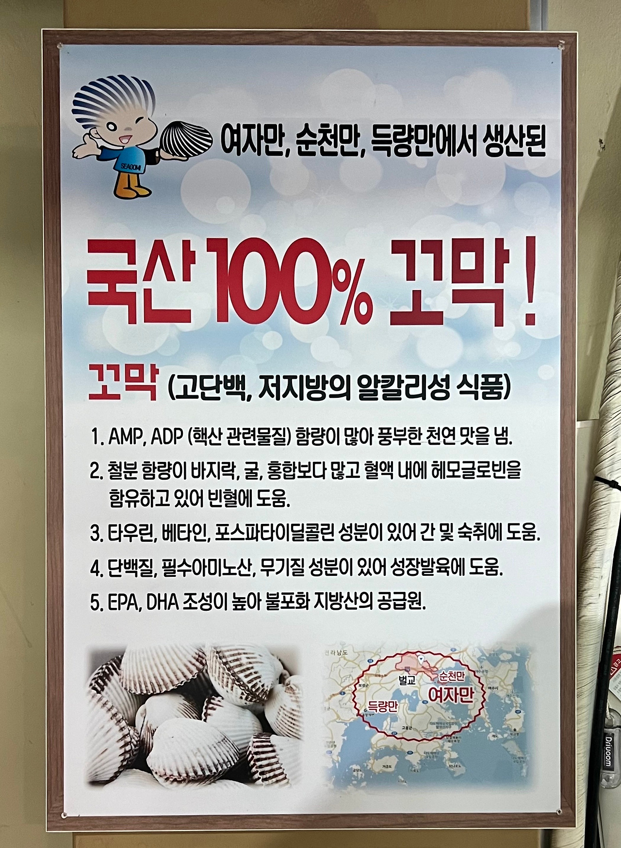 <엄지네 꼬막집>의 홍보 안내판을 보니 "(벌교 부근의) 여자만, 순천만, 득량만에서 생산된 국산 100% 꼬막"이라고 소개돼 있다. 꼬막의 양을 보면 비싼 것도 아니었다. 후배의 평처럼 맛도 좋았다. 몇 해 전 벌교에 가서 '참꼬막'을 찾았더니, "여기가 벌교지만, 좋은 꼬막은 다 서울로 올라갔다"고 얘기하더라. 정작 벌교에서는 최상의 꼬막을 찾기 힘들다. 씁쓸한 현실이다.