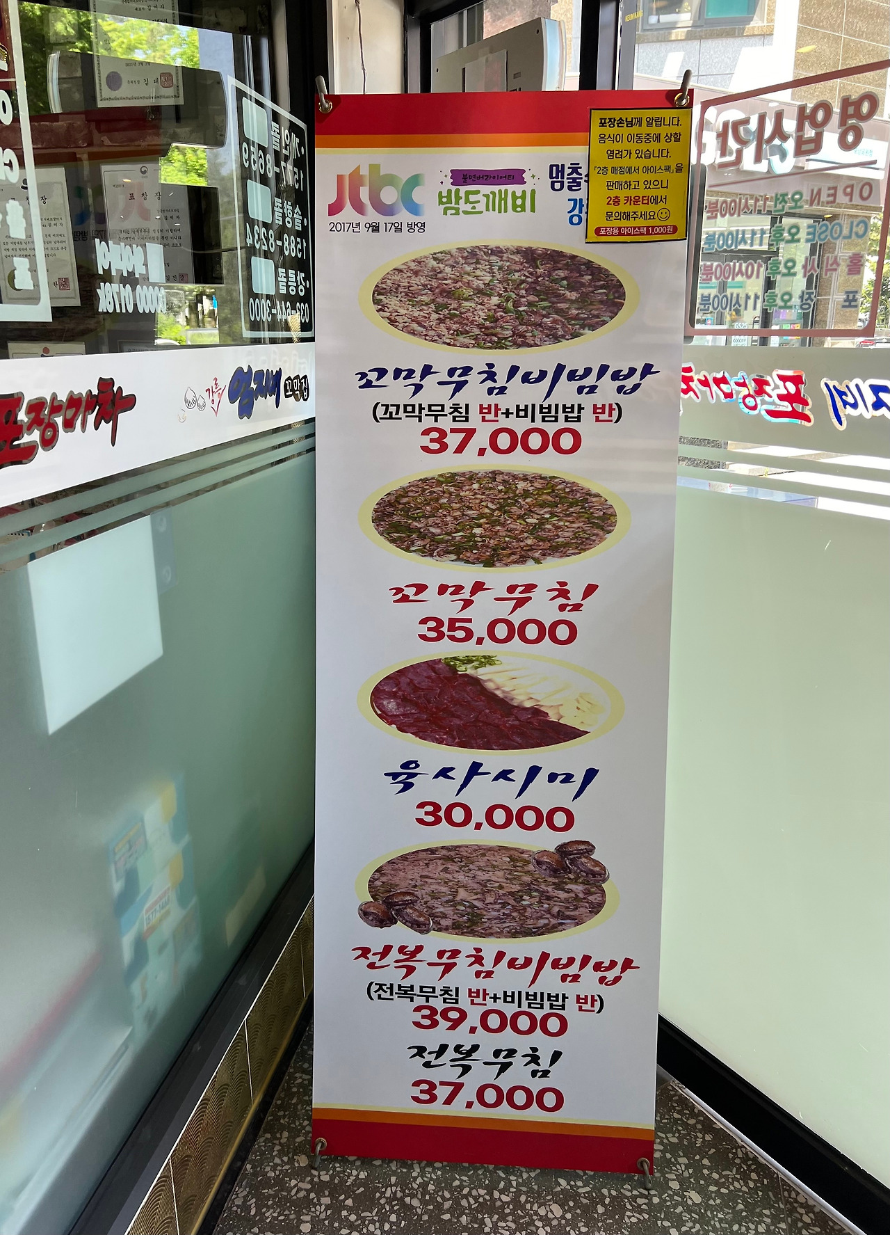 일단 비빔밥부터 먹고, 꼬막무침은 공깃밥을 추가해 각자의 방식으로 비벼먹거나 반찬삼아 먹거나 하면 된다. 두 명이 먹었는데, 꼬막무침이 2/3쯤 남아 포장해달라고 해 숙소에 가서 햇반에 비벼 저녁으로 먹었다. 이 집의 메뉴는 생각보다 다양했다. 육사시미, 오징어순대, 문어, 갑오징어, 짱뚱어탕, 각종 생선조림, 생삼겹주물럭까지. 물론 이른 점심에 두 명이어서 다른 메뉴는 맛보지 못했다.