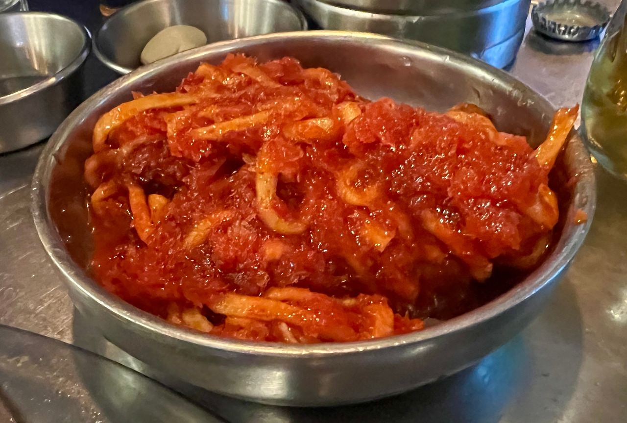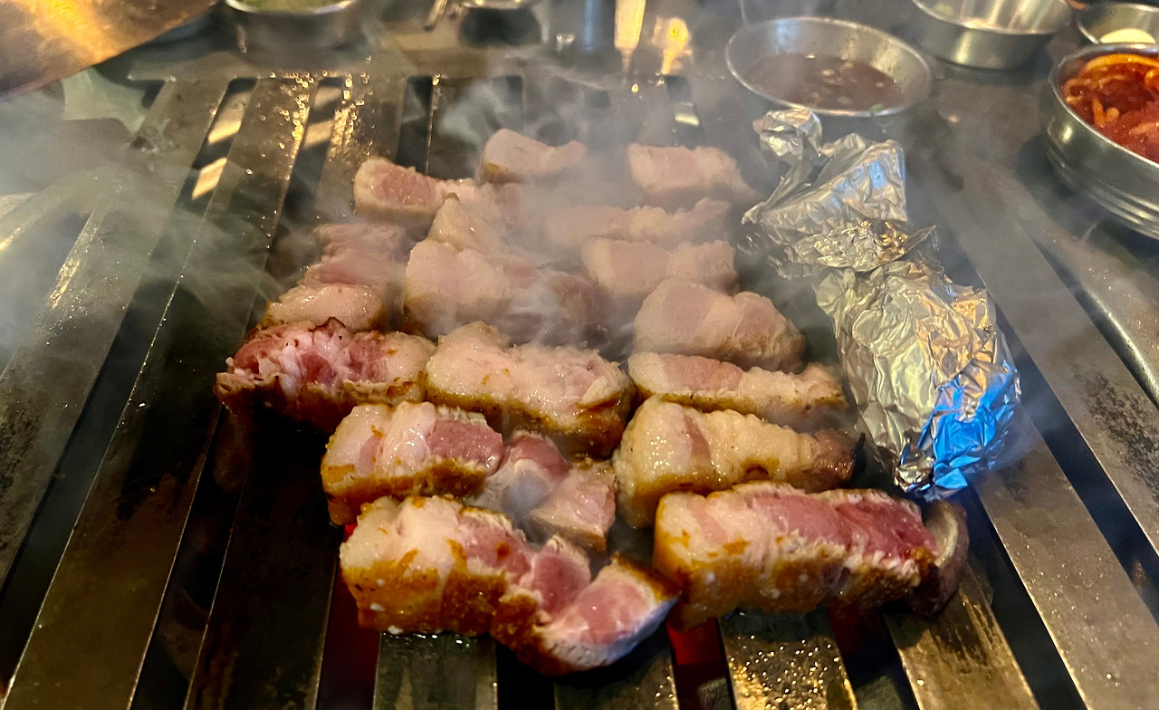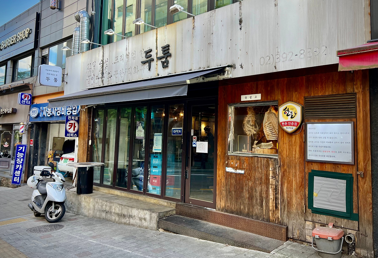 충정로역 부근 <두툼>. 21일 간의 숙성이라는 홍보 문구에서 보듯이 드라이에이징한 고기를 내놓는다. 에이징 기간은 최소 7일 최대 21일. 고기 맛이 정말 좋다. 껍데기항정살은 독특하다. 무채는 살얼음이 생기도록 차게 해서 내놓고, 부산의 대선 소주도 갖다놨다. 고기는 직원이 구워준다. 오후 6시에 가면 웨이팅을 해야 한다. 다 좋은데, 너무 시끄러워서 대화를 할 수가 없다. 그래서 기본으로 시킨 고기만 먹고 서둘러 나왔다.