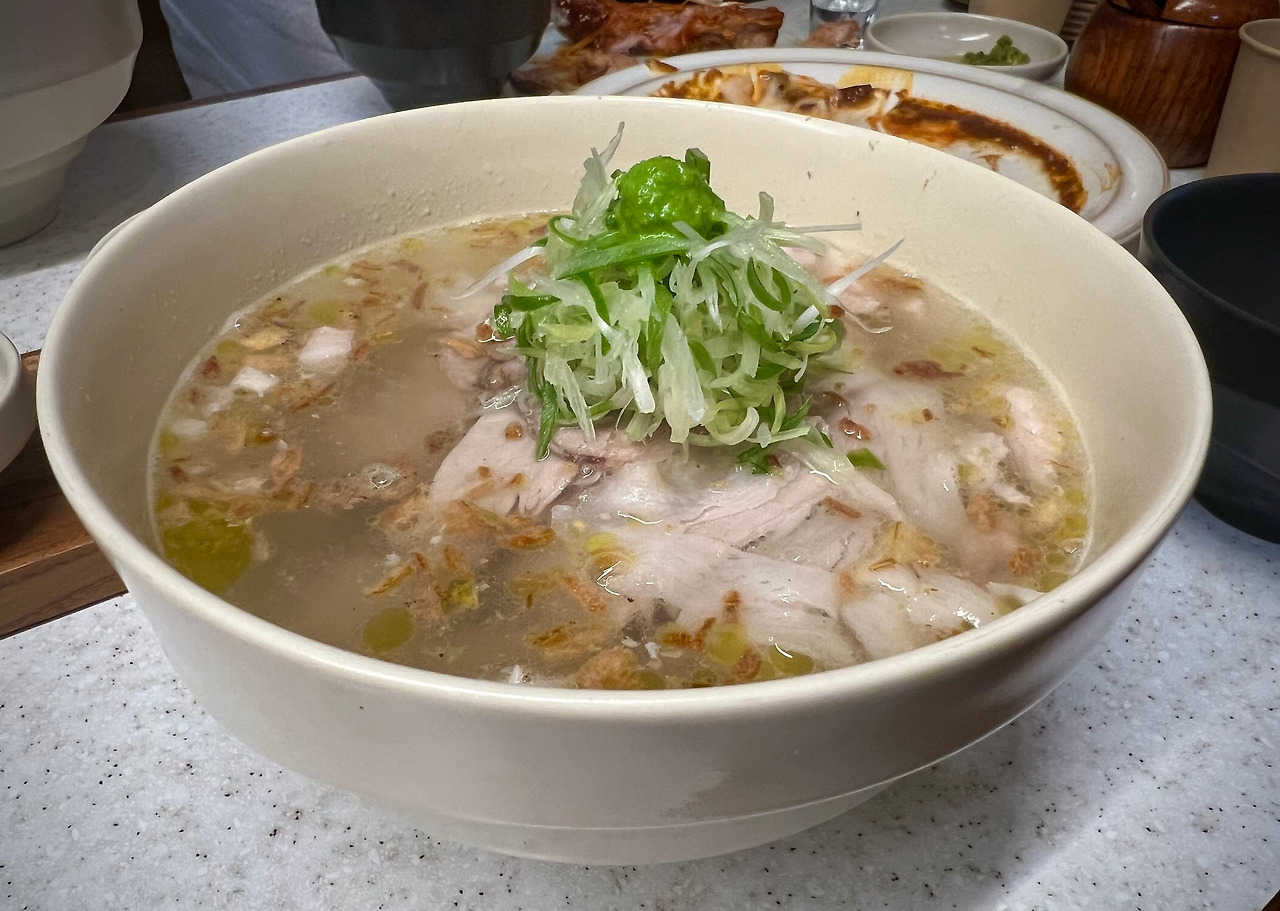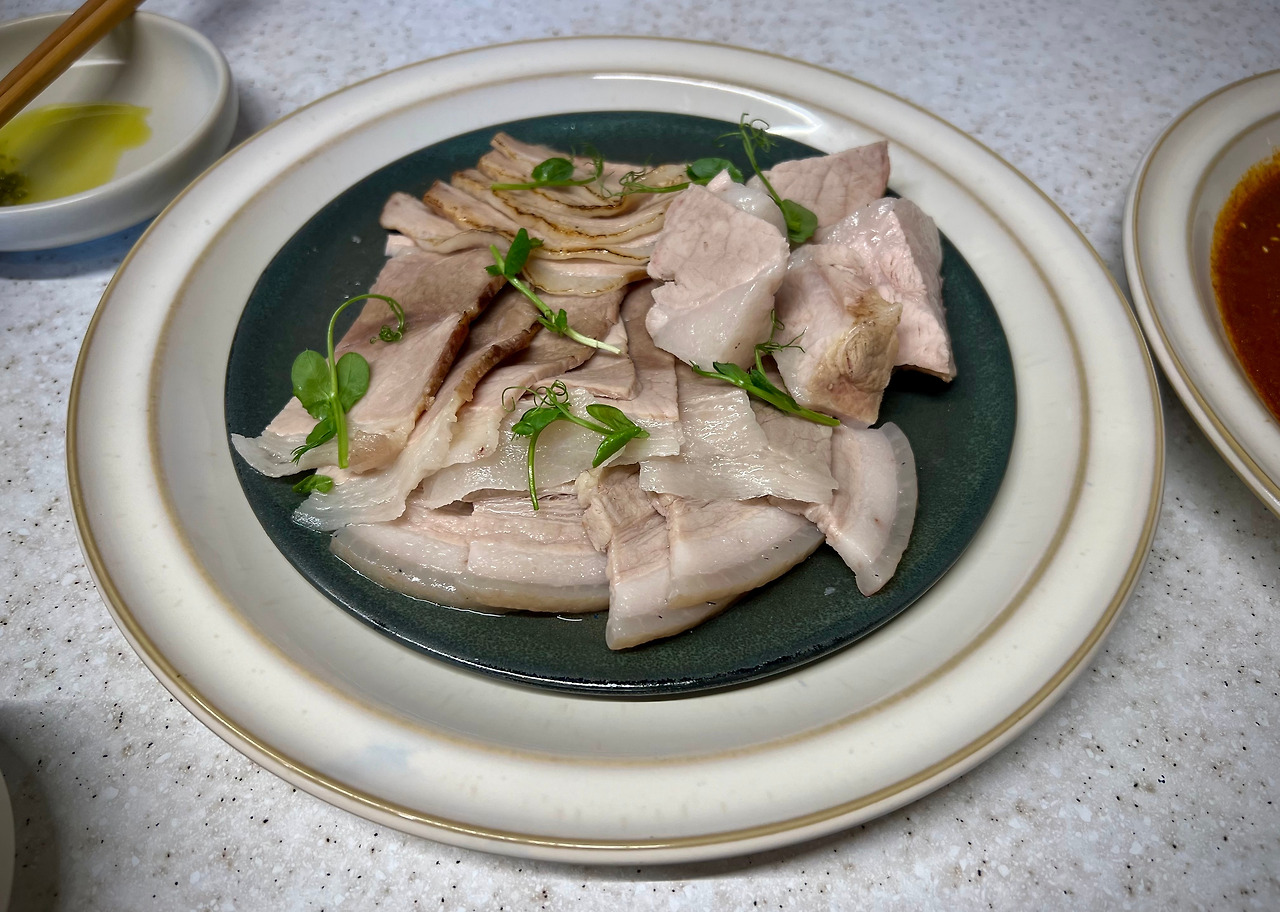 우리 일행이 먹은 음식은 △백랑국밥 - 제주흑돼지 난축맛돈 뒷다리 수육이 올라간 흑돼지국밥 △난축맛돈 수육 - 14시간 부드럽게 익힌 난축맛돈 흑돼지 수육과 유자새우젓, 보리쌈장, 갓무침 (※ 항정, 삼겹, 전지, 후지 등 다양한 부위가 나왔는데, 홈페이지 메뉴에서는 못 찾았다) △난축맛돈 흑돼지 쪽갈비 등이다.