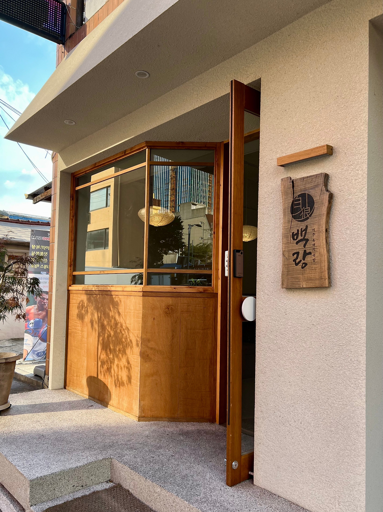 <백랑(白狼)>. 용산 철도기지창 부근에 있는 작은 식당이다. "제주흑돼지 난축맛돈으로 만든 흑돼지 국밥과 한우 양곰탕면"을 판다고 소개하고 있다. 프랑스 음식점 <메종 루블랑(Maison Loup Blanc)>의 오너세프인 신민섭 대표가 운영하는데 두 곳은 지근거리에 있다.