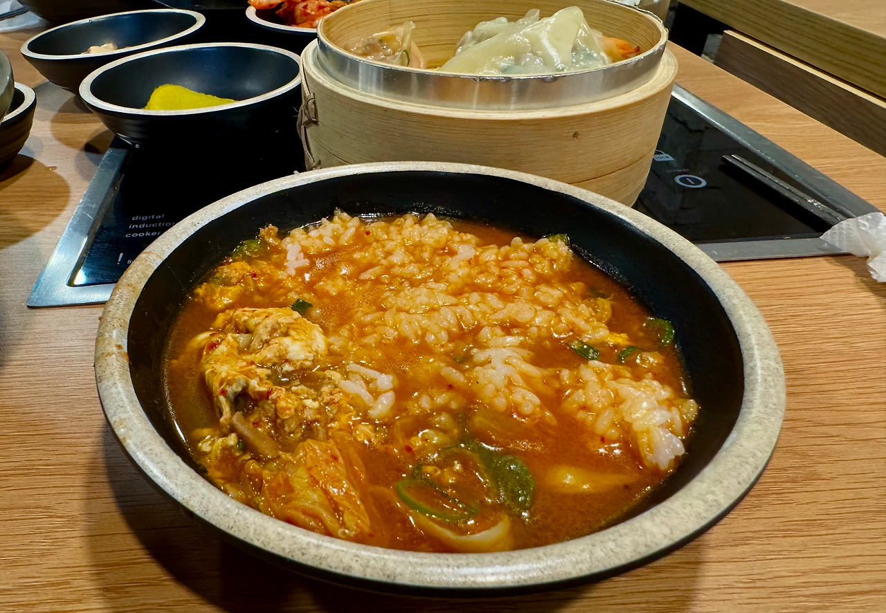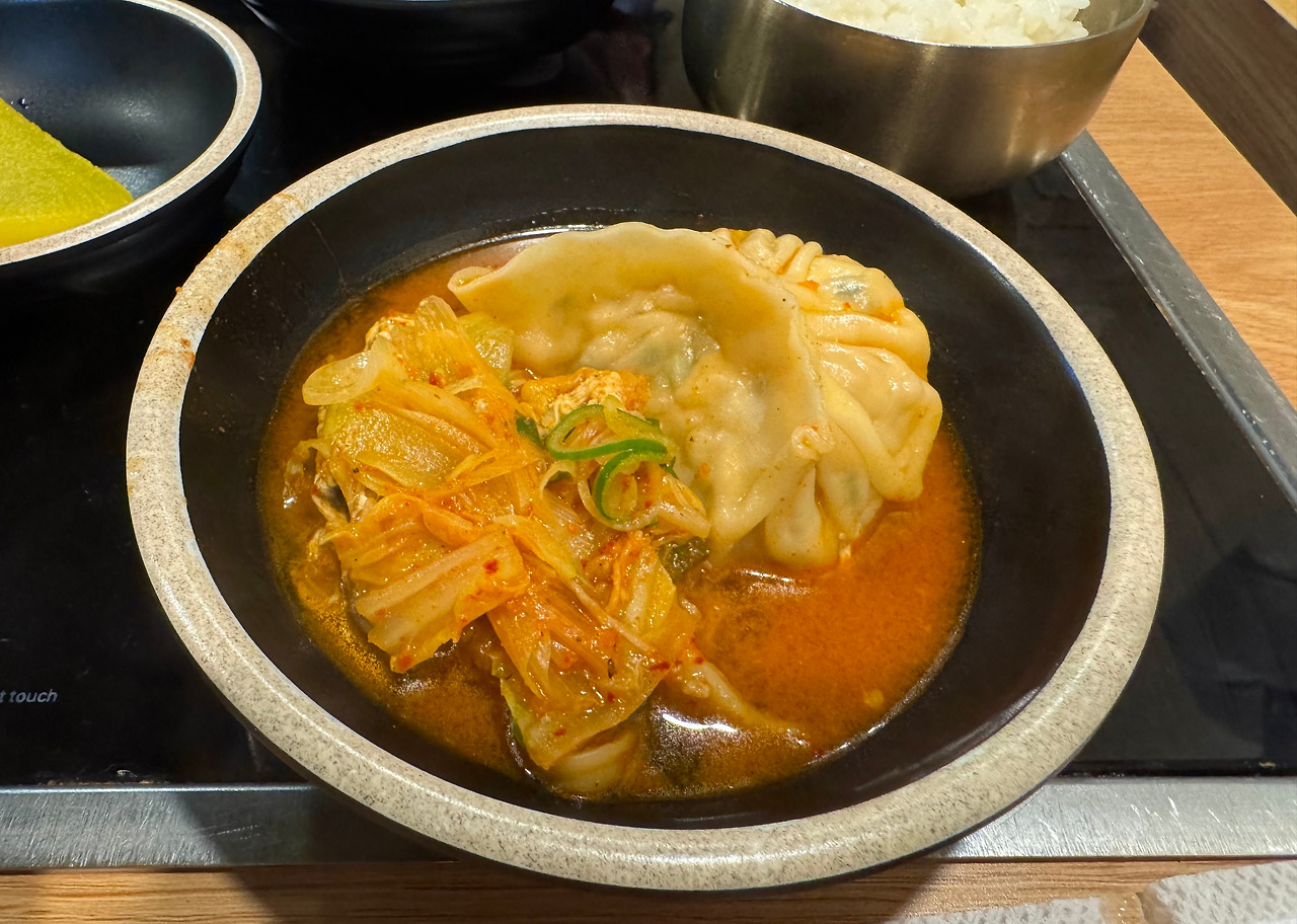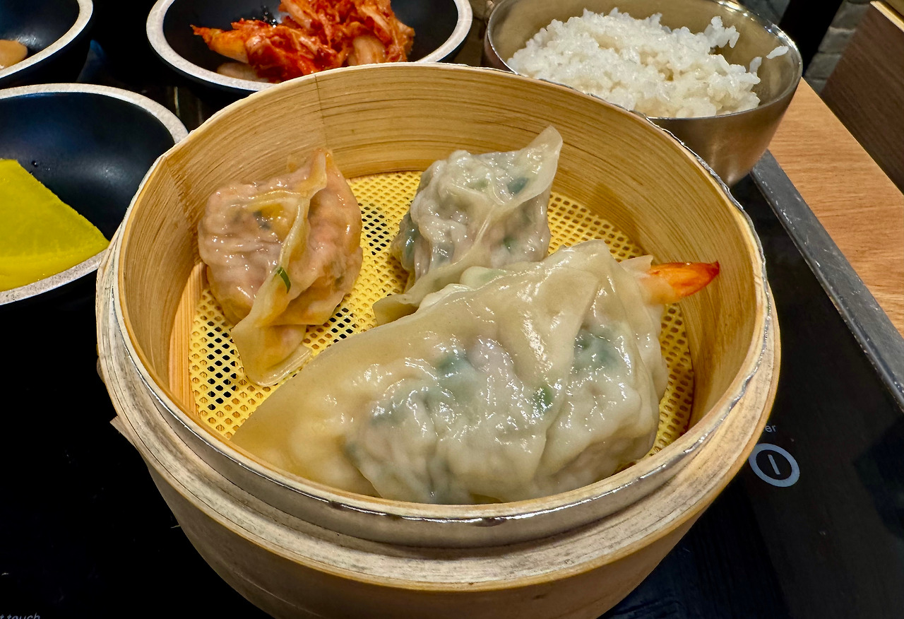 만두는 새우, 김치, 고기 세 종류가 메인이다. 나중에 디저트라며 팥만두를 서비스로 내줬다. 팥만두는 처음 맛봤는데, 달아서 내 취향은 아니다. 만두국밥정식과 얼큰칼국수정식을 시켰다. 텁텁하지 않은 육개장 국물 베이스의 만둣국과 칼국수였다. 정식엔 새우, 김치, 고기 만두를 한 알씩 내준다. 크기가 다른 만두의 두 배쯤되는 새우만두가 압권이다.