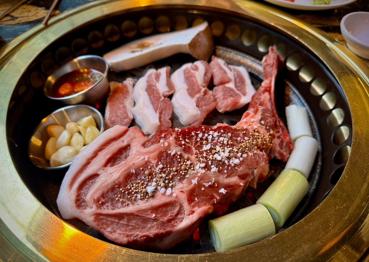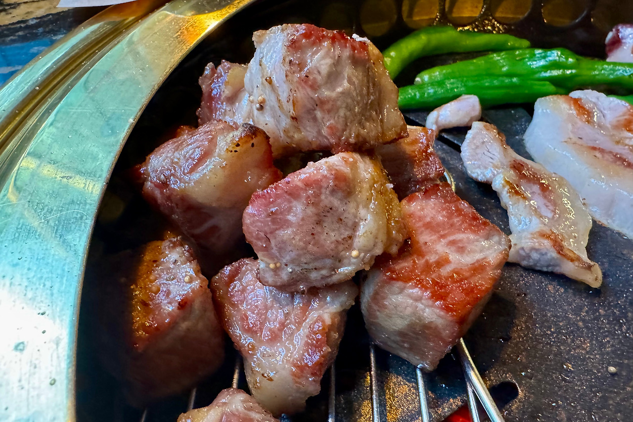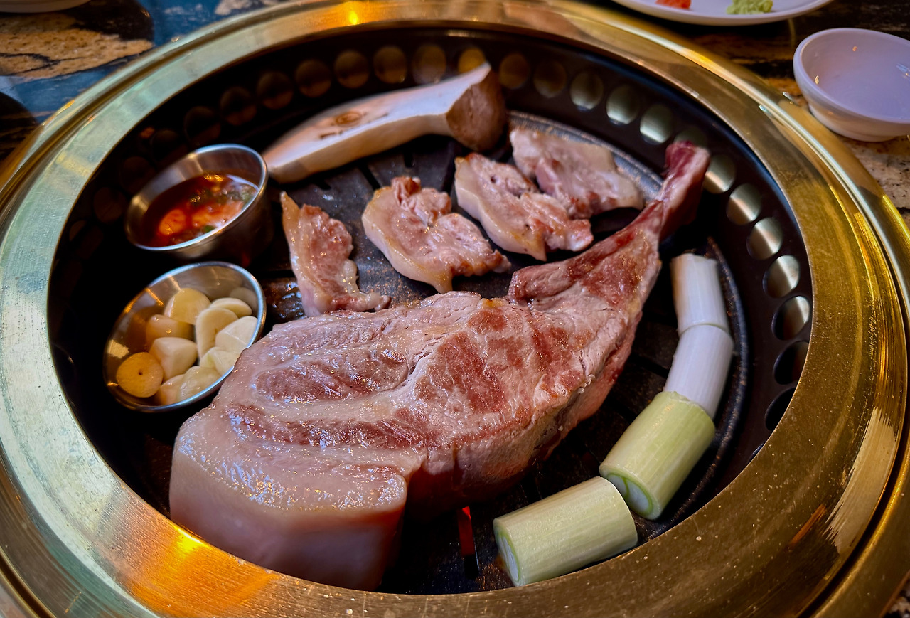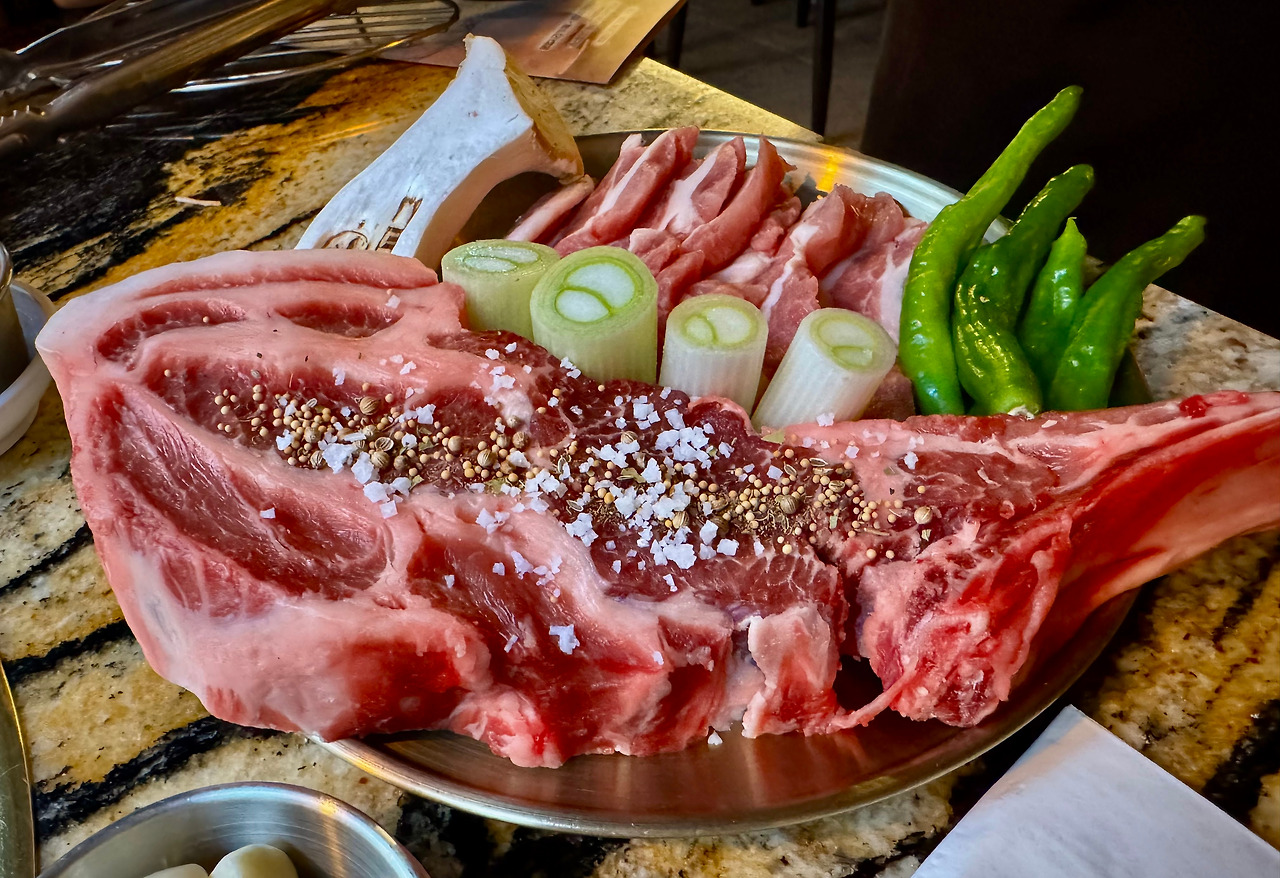 로얄피그의 고기는 생소한 'YBD(얼룩도야지)' 품종을 쓴다. YBD는 요크셔(Y)+버크셔(B)+듀록(D) 3종을 교차 교배시켜서 새롭게 만든 품종이다. 시그니처 메뉴는 '어깨꽃살(숄더랙)'이다. 도끼처럼 큰 뼈에 붙어있는 고기다. YBD를 검색해보니 네이버블로그 '붕어'에서 이렇게 설명하고 있다.