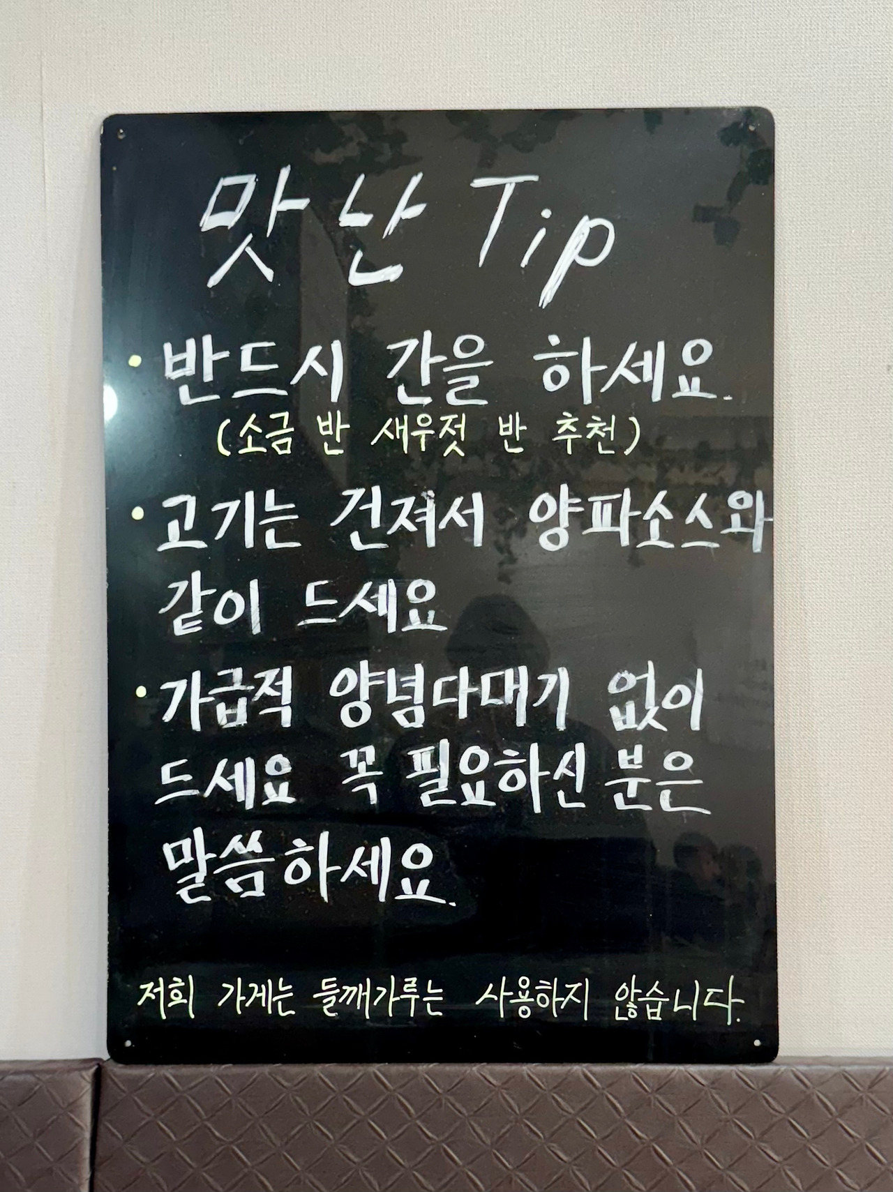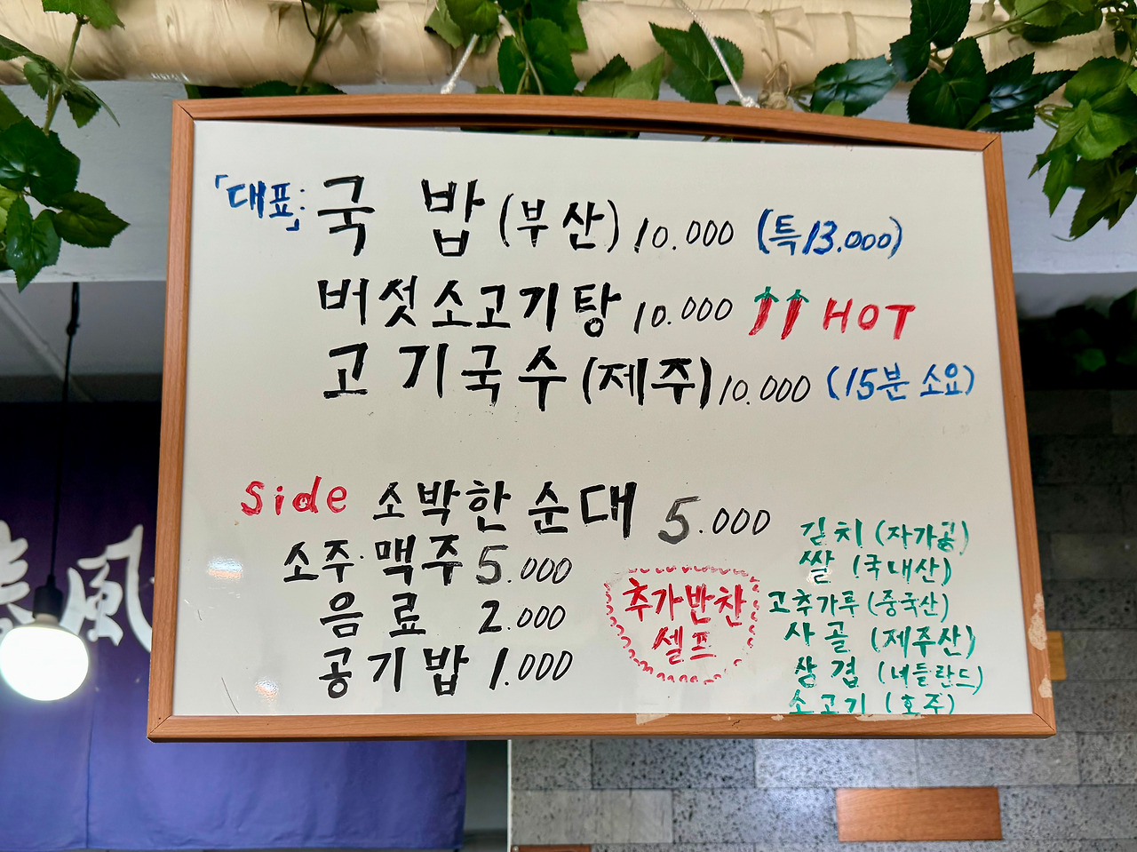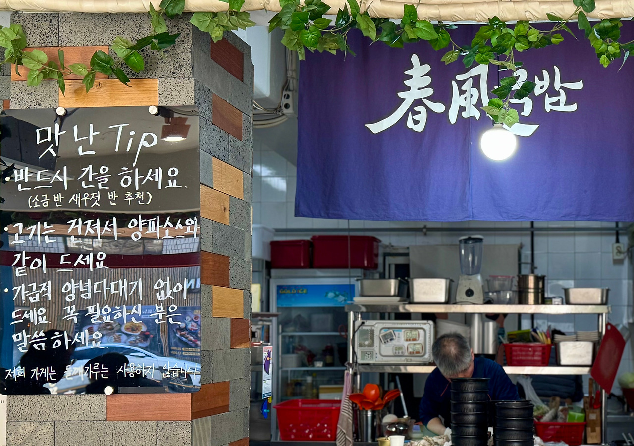 포장판매 안 한다는 안내 문구가 내겐 재밌는데, 정반대의 반응도 있을 것 같은 느낌이 든다. 혼밥하면 고기 더 준다는 홍보 문구는 감성도 건드리며 혼자도 눈치 보지 말고 들어오란 뜻이어서 플러스 점수. 다음에 가게 되면, 고기국수(제주)를 먹어봐야겠다. 국밥(부산)과 같은 리뷰를 쓸 것 같은 느낌적 느낌.