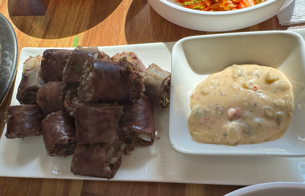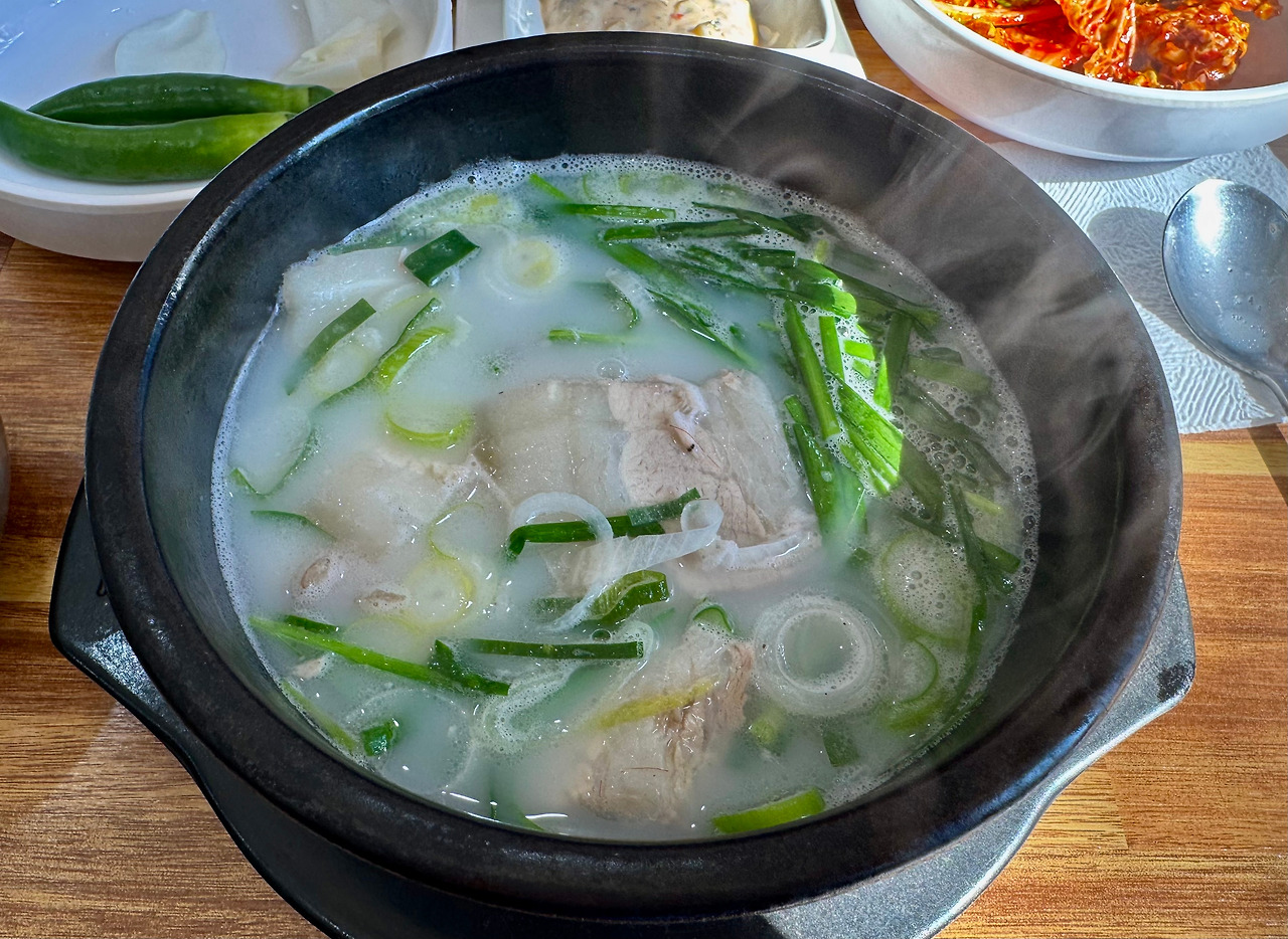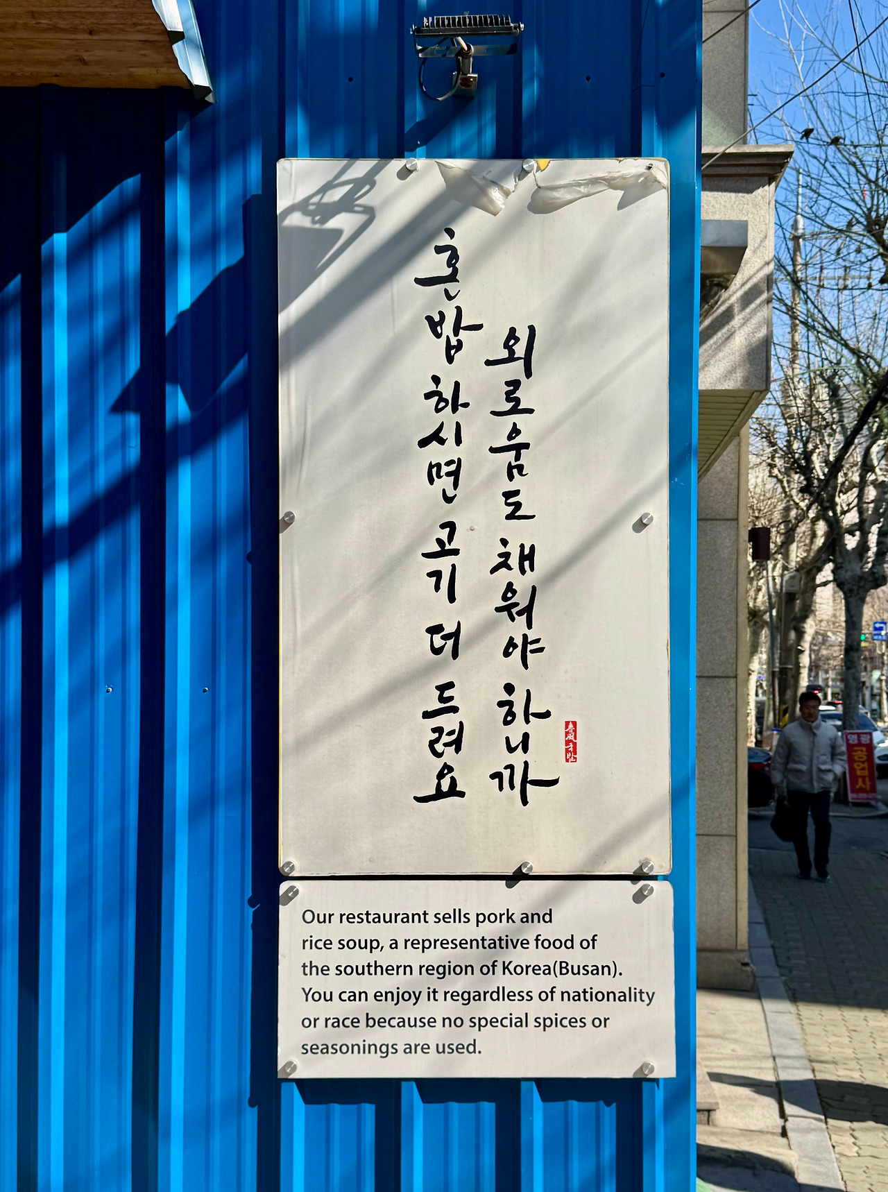 포장판매 안 한다는 안내 문구가 내겐 재밌는데, 정반대의 반응도 있을 것 같은 느낌이 든다. 혼밥하면 고기 더 준다는 홍보 문구는 감성도 건드리며 혼자도 눈치 보지 말고 들어오란 뜻이어서 플러스 점수. 다음에 가게 되면, 고기국수(제주)를 먹어봐야겠다. 국밥(부산)과 같은 리뷰를 쓸 것 같은 느낌적 느낌.