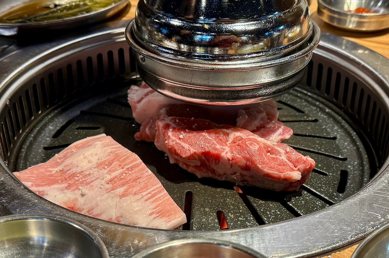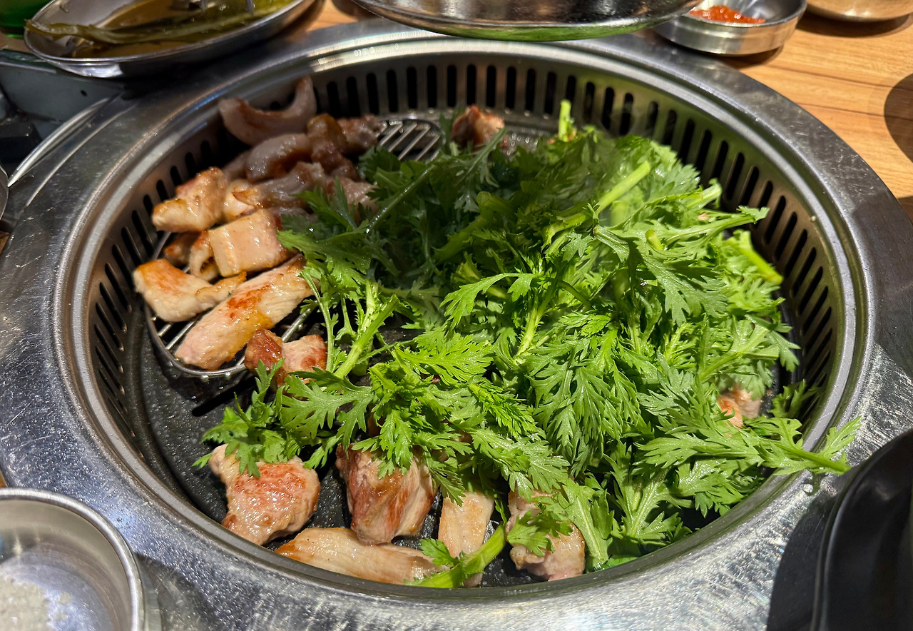 <한담>은 고기와 함께 불판에 쑥갓을 올려준다. 미나리, 고사리, 콩잎이 나오는 건 봤는데, 쑥갓을 준 곳은 처음이다. 고기와의 궁합이 괜찮았다. 내가 돼지고기 구이와 최상의 궁합으로 치는 건 여리고 향이 강한, 봄철의 야생 곰취다. 곰취라고 해도 재배한 건 잎이 크고 향이 없어 그 맛이 안 난다.