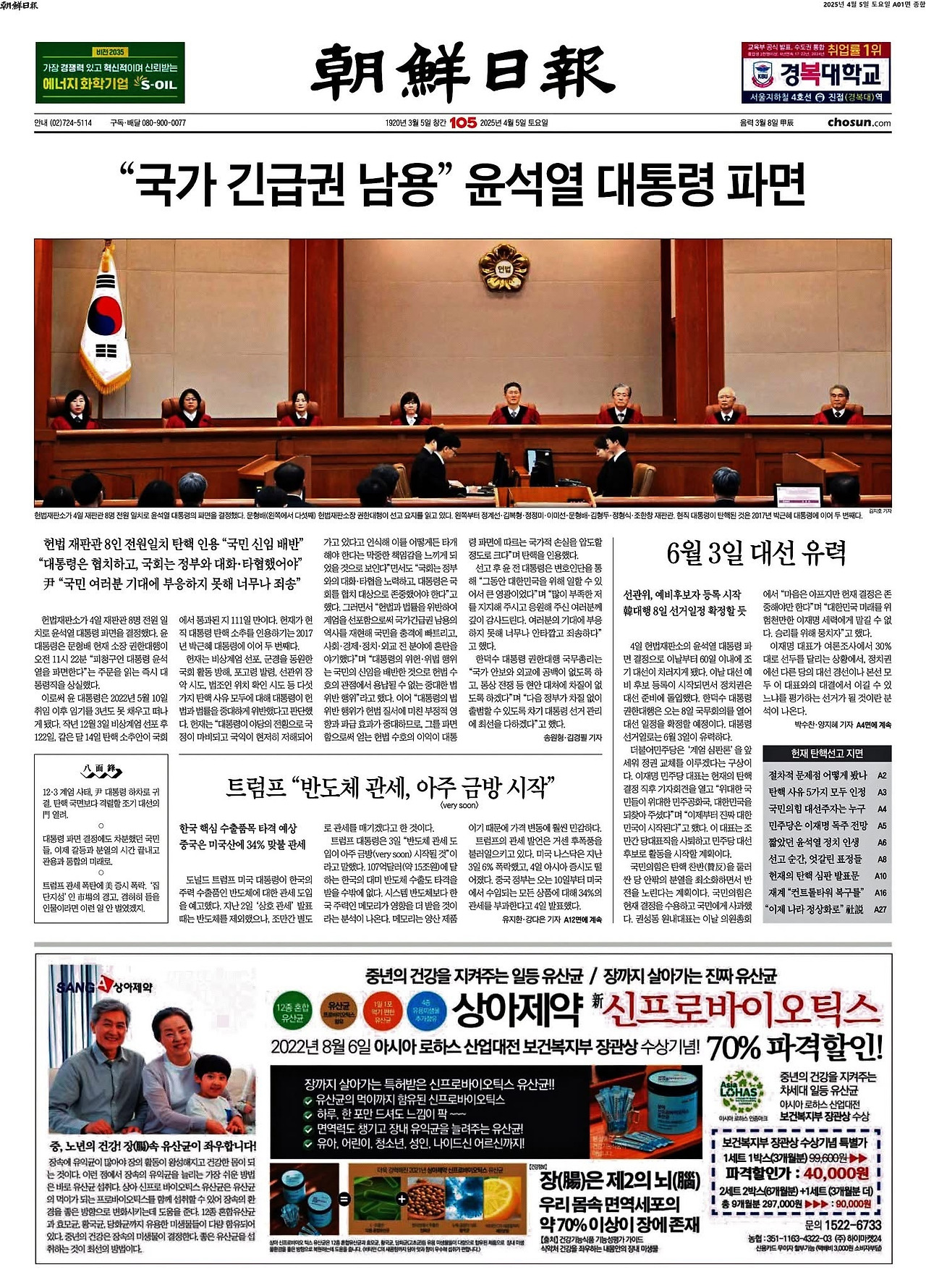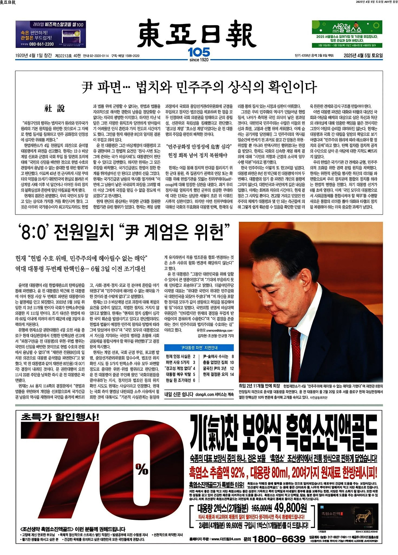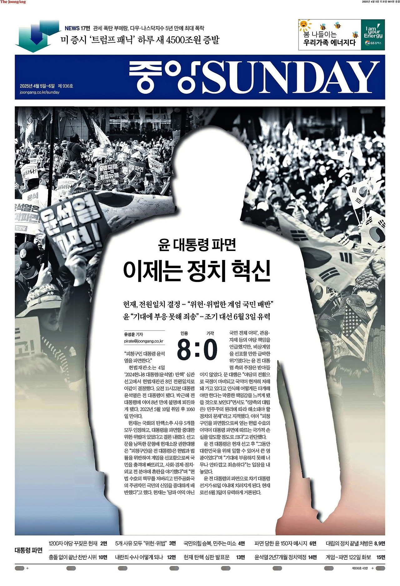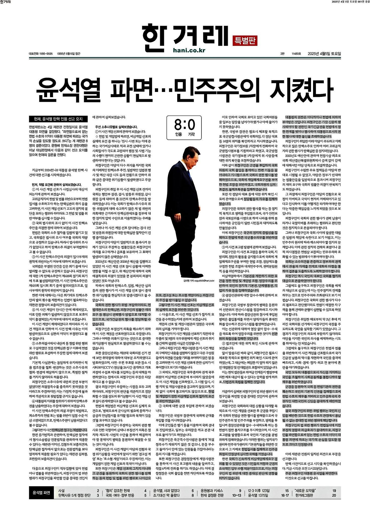 4월 4일 헌법재판소의 주문 "대통령 윤석열을 파면한다"