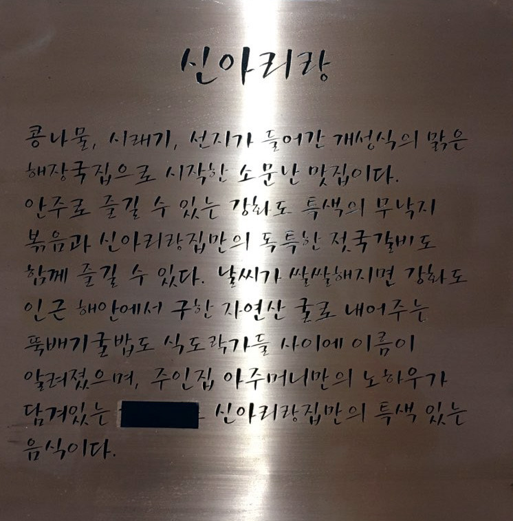 그런데 7~8년 전, 강화군 농업기술센터에서 강화도 향토 음식을 널리 알리자는 취지로 신아리랑의 젓국갈비 레시피를 공개하도록 요청했다.
