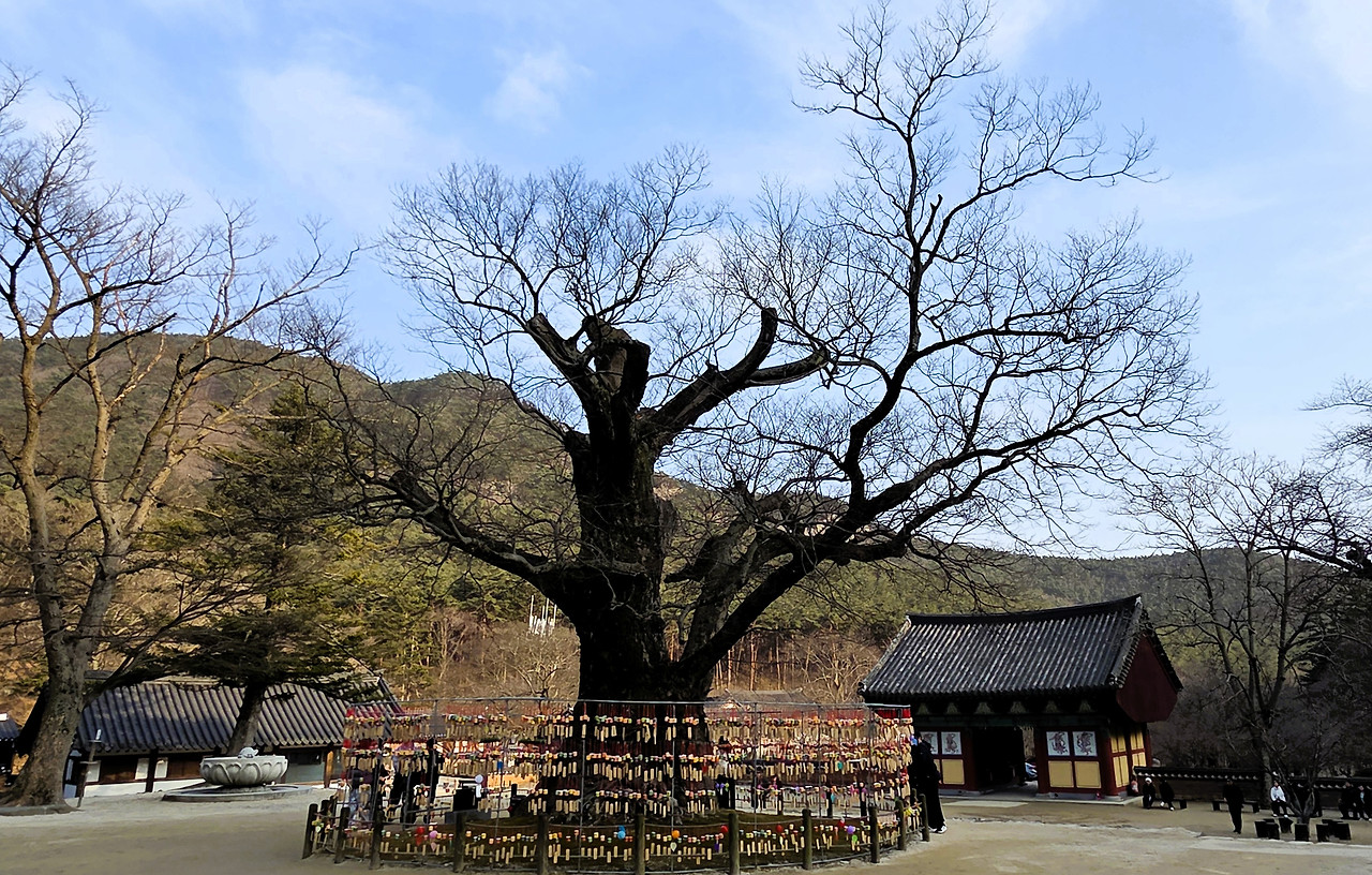 늦은 오후에 절에 들었다. 절에서 나오는 사람들의 얼굴에는 미소가 흐른다. 내소사의 본뜻은 새로 태어난다는 의미이다. 숲길을 걷는 것만으로도 심신이 개운해 짐을 느낀다. 전나무 숲길은 곧 벚나무 길로 이어진다. 내소사는 설경으로 유명하다. 하지만 오늘처럼 눈이 내리지 않아도 괜찮다. 벚꽃이 눈처럼 날리는 봄이 오기로 약속했기 때문이다. 사천왕상이 있는 천왕문을 지나 경내에 들어서면 천 년의 느티나무가 천 가지 소원을 허리에 두르고 있다. 이 나무가 할머니 당산나무다. 이 나무는 대웅보전을 뒤에 두고 사람들의 소원을 들어주는 정령일 것이다. 나무를 돌며 소원을 거듭 읊조린다. 사찰의 대웅보전, 영산회개불탱화, 법화경 절본 사본, 그리고 고려 동종은 국가 보물로 지정되어있다. 돌계단을 오르면 오른쪽으로 범종각 왼쪽에는 고려 동종이 있는 보종각이 있다. 1m 남짓의 동종은 1222년 이곳 내변산에 있었던 청림사에서 제작이 되었는데 그 절이 폐사되고 오랫동안 땅속에 묻혀 있던 것을 1853년에 발굴하여 내소사에 옮겨졌다. 633년 백제 무왕 때 설립된 이 절이 고려의 동종을 품게 된 사연이다.
