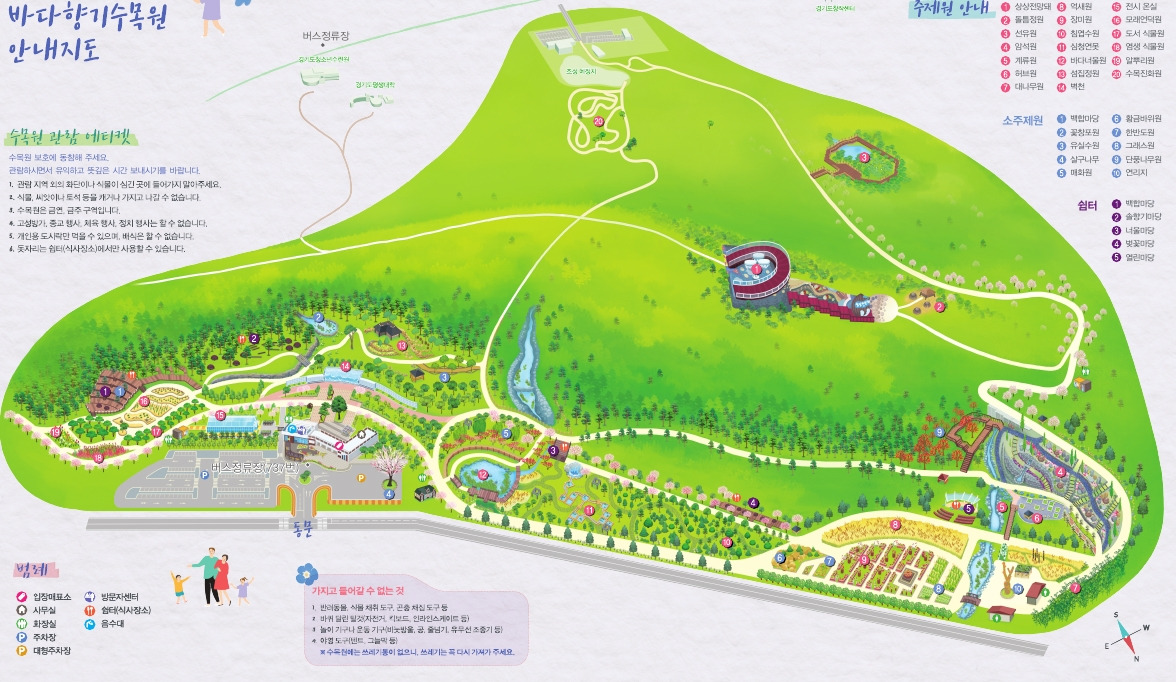 수목원의 산책길은 숲을 거닐 수 있는 2km, 꽃의 향을 주제로 한 3km, 바다를 테마로 한 4km 등 세 가지 경로가 있다. 경로가 정해져 있지만, 경로대로 걷지 않는 것 또한 하나의 경로이다. 이리저리 오르락내리락하며 느낌이 가는 대로 걸어서 나만의 산책 코스를 만드는 것도 즐거운 일이다.