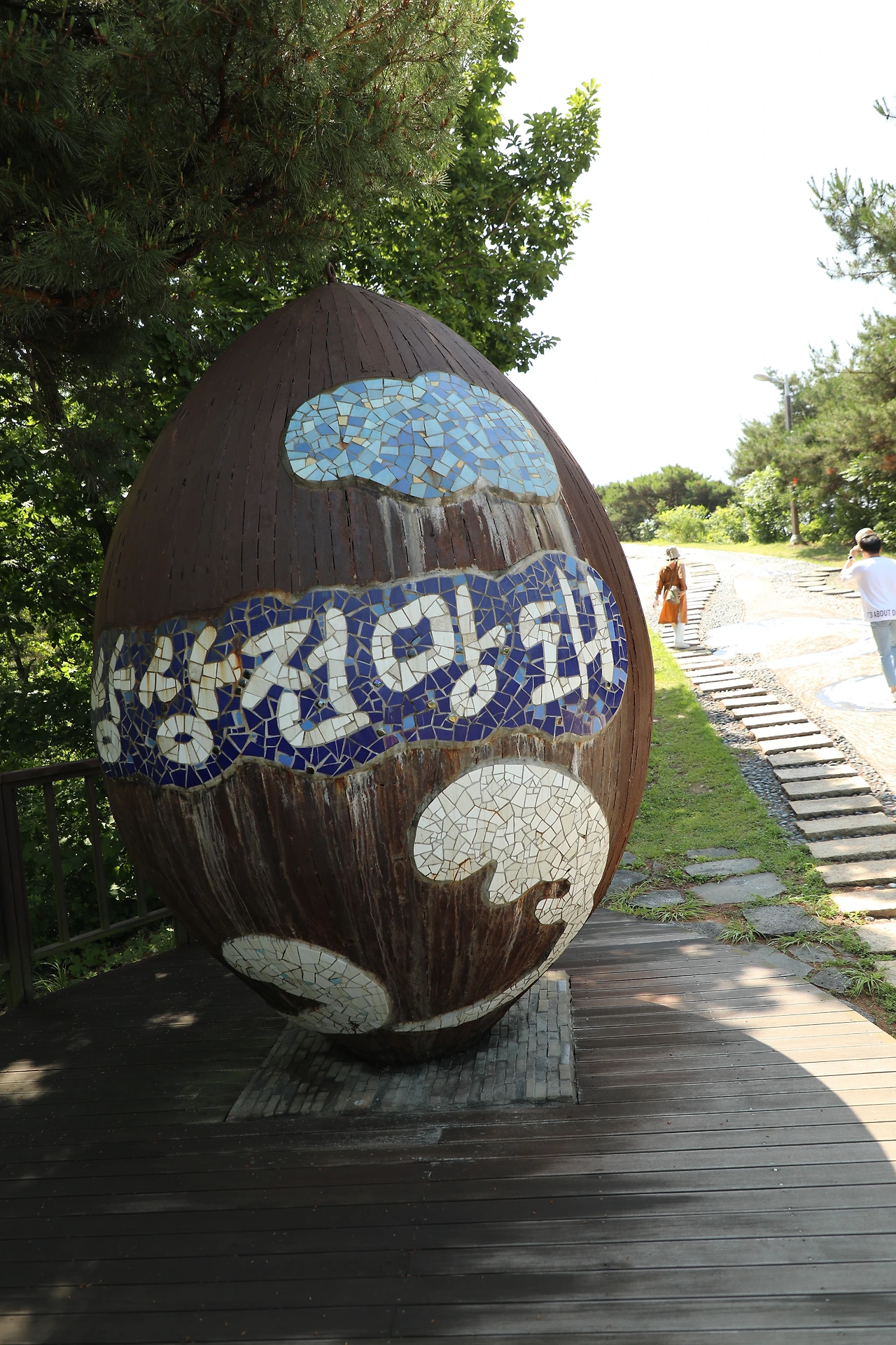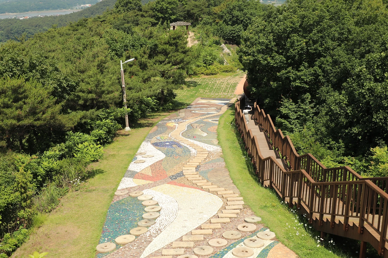 선감도의 정상이자 수목원의 정상인 상상전망대로 향한다. 무엇이든 상상하면 된다는 전망대의 또 다른 이름은 "상상전망돼"이다. 이정표에 쓰인 글씨는 오타가 아니다. 상상하면 모두 된다는 뜻이니 소원 하나를 품고 상상전망대에 오른다. 전망대가 보이는 곳부터는 지압을 위한 돌멩이들이 박혀있다. 신발을 들고 아장아장 돌길을 걸어 본다. 발은 얼얼하지만 건강해진 것 같다.