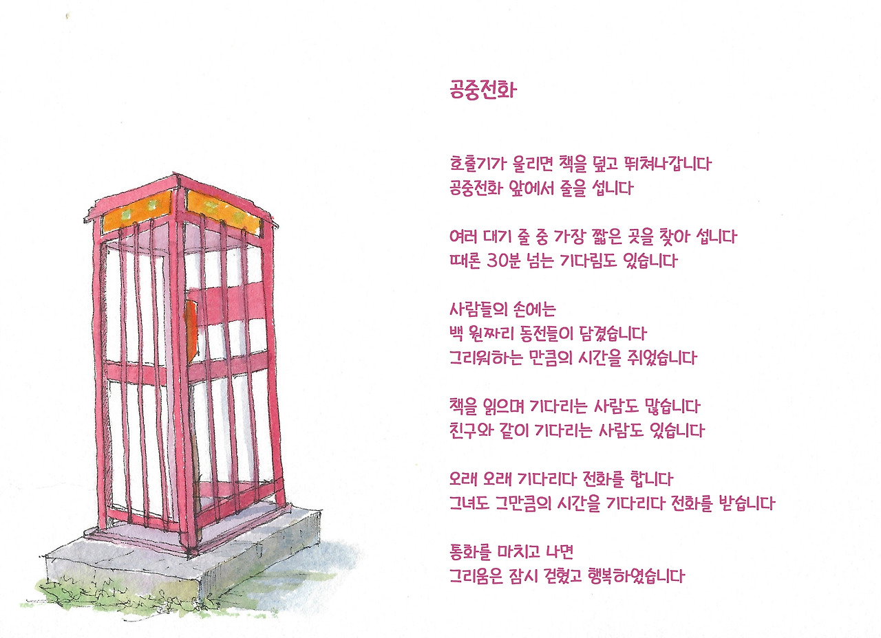 휴대폰 시대이전 삐삐라는 호출기를 허리에 차고 다녔던 시절, 대학 도서관에서 공부하다가 호출기가 울리면 책을 덮고 나가 공중전화에 가면 공중전화 부스 뒤로 길게 늘어선 나와 같은 사람들이 많았습니다.