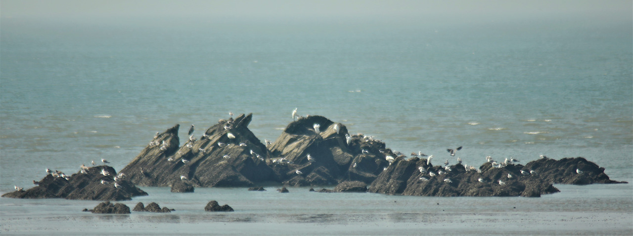 해변에 도착하자 보이는 갯바위에 새들이 무리를 이루고 있다. 처음에는 저어새뿐인 줄 알았는데 사진을 찍어 확대해 보니 갈매기, 가마우지, 오리, 도요새, 노랑부리황새 함께 먹이를 살피고 있다. 여러 종류의 새가 한데 뭉쳐 있는 광경은 처음 본다. 갯벌에 먹이가 풍부하니 영역 다툼 없이 무리를 이루는 것 같다. 천연기념물로 지정된 저어새는 세계적인 멸종위기종이다. 동아시아지역에서 주로 분포하는데 오천여 마리밖에 서식하지 않는다.