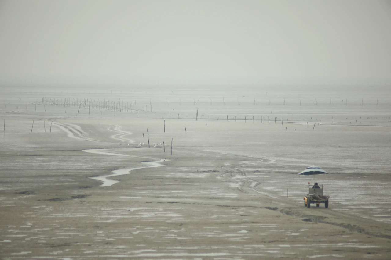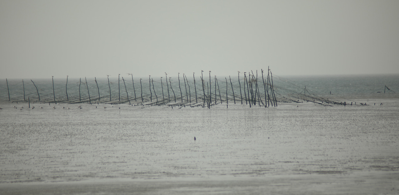 저어새 무리가 잘 나타난다는 또 다른 서식지인 근처의 영뜰 해변을 찾았다. 이 해변은 갯벌을 길게 두르는 건간망이 갯벌의 처음부터 끝까지 펼쳐져 있다. 그물의 길이는 수 km에 이른다. 건간망 조업은 밀물에 들어온 물고기가 썰물에 나갈 때 그물에 걸리게 하여 잡는 방식이다. 저어새들이 다른 곳으로 먹이활동을 하러 갔는지 새의 모습이 보이지 않는다. 서식지라고 해서 항상 그곳에 머무는 것은 아닌가 보다. 정자에 앉아 하늘 아래 드넓게 펼쳐진 모래사장에 눈이 머문다. 그물에 걸린 고기를 걷으러 경운기를 타고 일을 나서는 어부의 뒷모습이 아련하게 멀어진다.