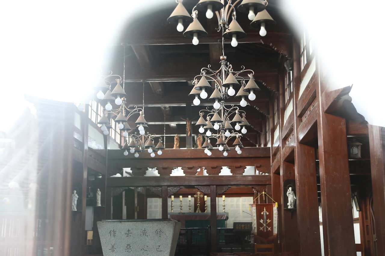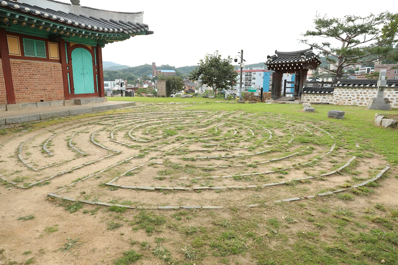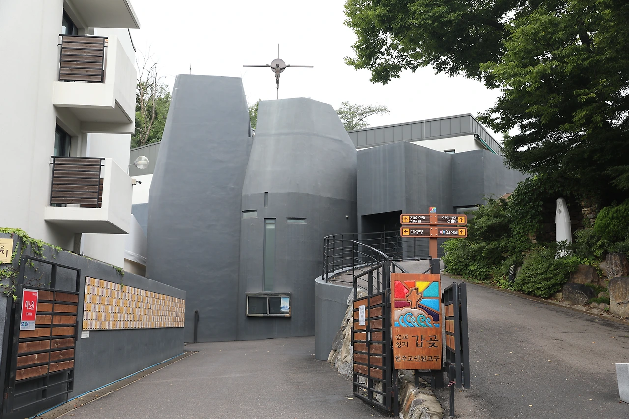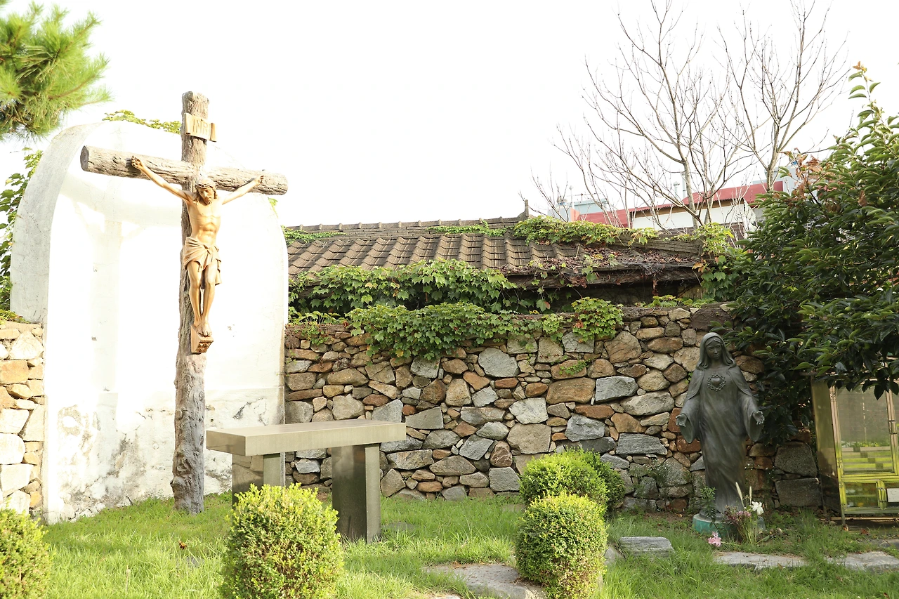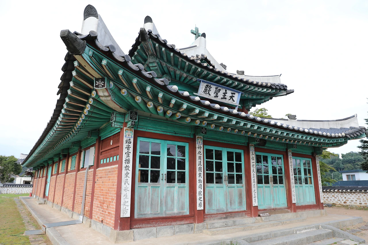 천주성전이라고 쓰인 현판이 걸린 본당은 2단 기와지붕을 얹고 있다. 지붕에는 한옥에서 자주 볼 수 있는 용머리가 장식되어 있다. 실내는 문이 잠겨 들어가 볼 수는 없다. 아직 해가 완전히 기울지 않아 유리창을 통해 내부에 빛이 들어오고 있다. 옛날 학교의 문과 같은 현관문 너머 예배당을 들여다본다. 내부의 기둥과 바닥은 목조로 장식되었고 조명만이 확연한 유럽식이다. 일요일에는 오전에 두 차례에 걸쳐 예배가 열린다는 안내문이 있다. 1900년에 지어진 목조건물에서 예배를 드리는 느낌은 어떠할까? 나무에 스며드는 고요한 오르간 연주가 궁금하다.