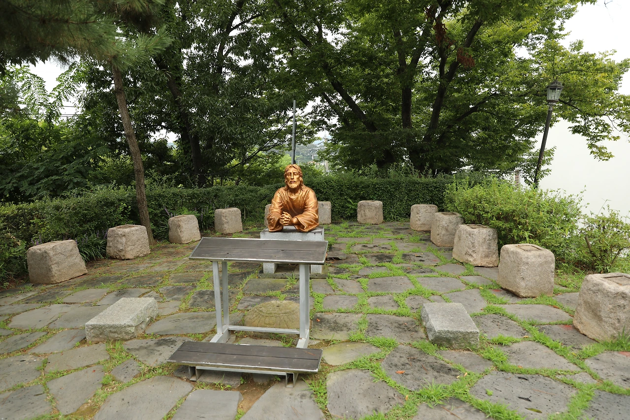 이곳에는 특별한 나무가 있다. 누가 심었는지 알 수는 없으나 한 뿌리에서 나와 갈라진 은행나무가 세 그루가 있다. 세 그루의 나무가 비슷한 형상이다. 마치 순교한 세 명의 신자의 영혼이 깃들어 있는 것처럼 느껴지기도 한다. 숙연한 모습의 은행나무가 수많은 교인이 처형당했던 갑곶돈대 앞바다를 향해 위로를 전하는 모습이다. 은행나무 근처로 예수님이 십자가를 이고 골고다 언덕으로 향하는 체험을 할 수 있는 십자가도 마련되어 있다. 아직 날씨가 더워 고행 체험은 생략하였다.
