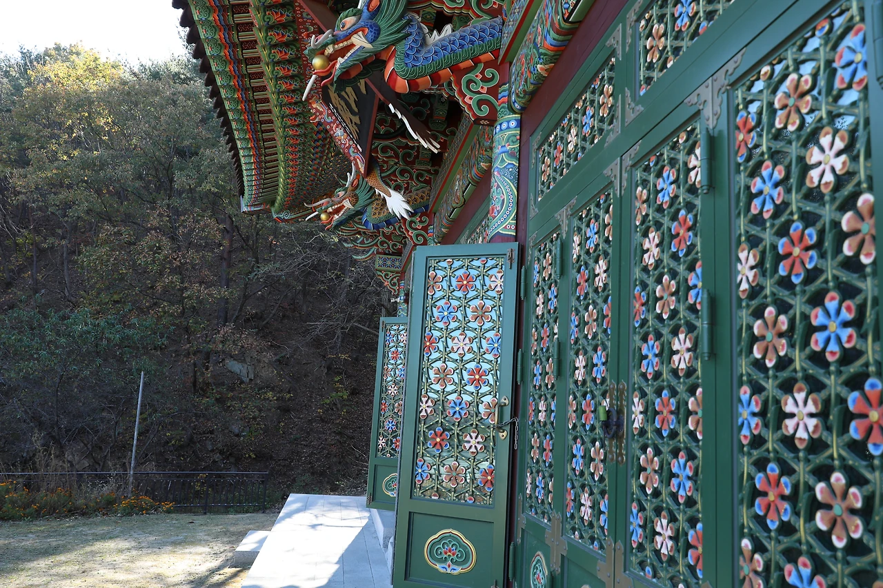 천정의 네모난 공간으로 이어진 계단을 오르면 대웅전을 비롯한 전각들이 있다. 기와의 빛깔은 초록과 옥빛을 섞어놓아 산과 바다의 색을 옮겨 놓은 것처럼 보인다. 범종각의 기와는 그윽한 노을빛이다. 영산전의 문살의 화사한 연꽃무늬가 사찰에 활기를 돋는다. 전각마다 문살의 무늬가 다르다. 다양한 색깔이지만 화려하지 않다. 야생화가 핀 들판을 보듯 수수하다.