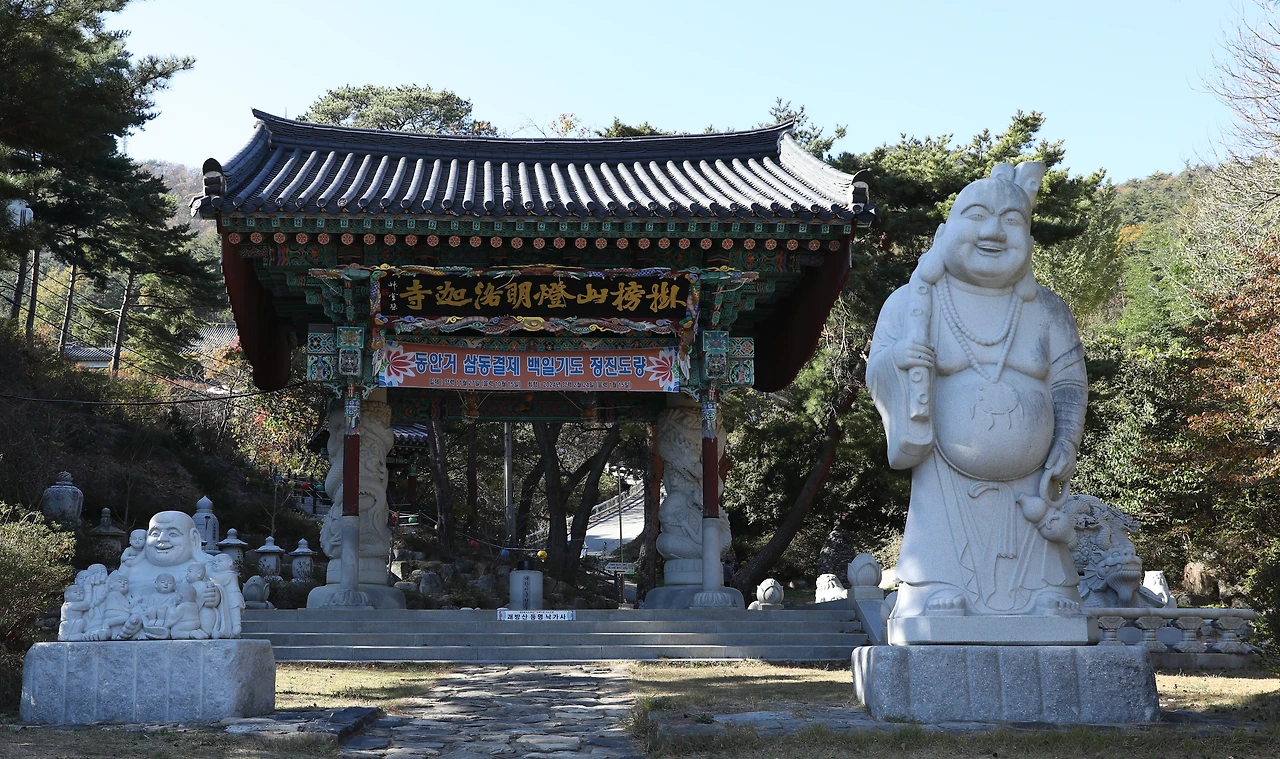 '괘방산등명락가사'라고 써진 일주문 앞의 포대화상이 미소로 맞이한다. 포대화상은 긴 눈썹에 배가 불룩 튀어나왔다. 일정한 거처가 없고 항상 긴 막대기에 포대 하나를 걸치고 다니며 동냥을 다닌다. 가끔 어려운 중생을 돌봐주기도 한다는 그의 배를 만지면 복이 온다고 한다. 아이들과 함께 행복한 표정을 짓고 있는 모습과 술병을 들고 포대를 두른 미소 짓는 모습의 조각이 일주문으로 드나드는 사람들에게 웃게 해 준다. 포대화상은 등명락가사가 인정한 18 나한 중 한 분이시다. 16 나한에 달마대사와 포대화상을 포함하여 18 나한을 영산전에 모셨다. 나한이란 부처님과 동등한 신통력을 갖춘 부처님의 제자라는 뜻이다.