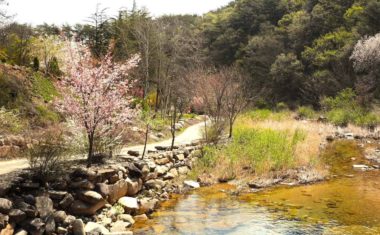 선유구곡 길과 이어진 칠우칠곡 길세심대를 빠져나와 아치형 인공다리 아래 제3곡 활청담(活淸潭)에 다다랐다. 바위 웅덩이에 갇힌 올챙이가 물이 넘실대기만을 기다리며 구석구석으로 헤엄을 친다. 제2곡 영사석(靈槎石)을 지나 제1곡 옥하대(玉霞臺)를 빠져나오면 길은 일곱 여울을 뜻하는 칠우칠곡으로 이어진다. 여울 길을 따라 봄의 향연을 마저 즐기기 위해 발걸음을 이어간다.