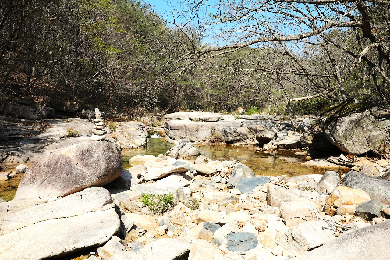 제7곡 영귀암바위에 뿌리를 내린 소나무는 한 줌의 흙을 움켜쥔 채 나무줄기를 꼿꼿이 펴고 있다. 진달래 꽃이 걸음마다 뿌려져 있고 물 위로 흘러가는 꽃잎도 있다. 길은 숲으로 이어지더니 제7곡 영귀암(詠歸巖)을 가리키는 표지판이 나타난다. 엉클어진 수풀을 제쳐내고 다시 계곡으로 들어섰다. 연못처럼 물이 고였고 커다란 바위가 수문이 되었다. 물소리가 고요하다. 기운이 모이는 장소로 소문난 것처럼 소원탑이 군데군데 쌓여 있다. 영귀암을 '이 바위에 올라서 노래를 지어 불러야 돌아갈 수 있는 곳'이라고 해석을 해야 할까? 한자 뜻만으로 풀어보면 그렇게 해석할 수도 있겠다. 노래를 짓고 불러야 한다니 얼마나 오랫동안 머물러야 하는 것일까? 공간은 넓지 않지만 주변의 모습은 계곡이 갖출 것은 다 갖추었다. 흥얼흥얼 표지판에 적힌 노래를 읊고, 소원을 빌며 깨끗한 자리에 탑을 쌓아 올린다.