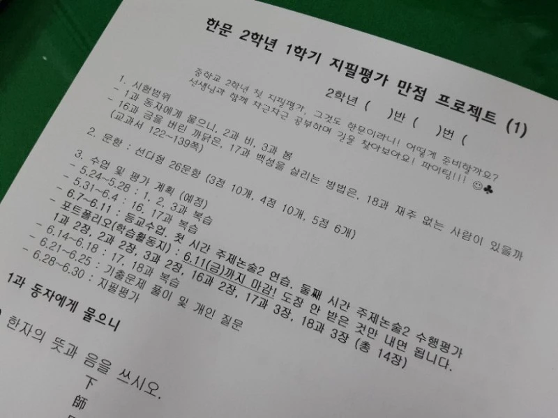 "저는 제 수업의 목표를 두 가지로 잡고 있어요. 한문 수업 시간에는 최대한 복습하고 부족한 부분은 개인적으로 공부하고, 여러 과목 할 때 시간 나눠 잘 공부할 수 있도록 도와 주려 합니다. 한문 시간에 공부하다 혹시 모르는 게 있으면 그때그때 물어보세요. 제가 아는 만큼, 최대한 마음을 담아 잘 가르쳐 드릴게요. 그게 저 어릴 때부터의 꿈이기도 하고, 여러분에게 해주고 싶은 것이기도 합니다." 2학년 지필평가 대비 자료로 복습하면서 오랜 꿈을 이야기했습니다. 장점은 살리고 아쉬운 점은 보완하며 늘 배우고 꿈꾸는 사람, 한문이란 영역으로 선한 영향 나누는 사람이고 싶습니다.
