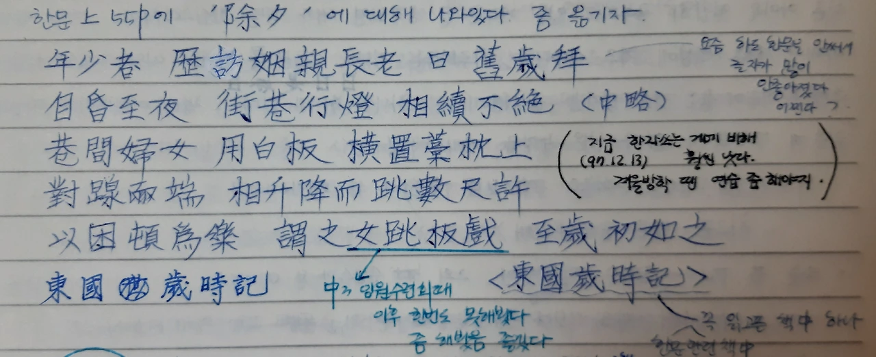 * 사진은 1995년 1월 30일(월) 섣달 그믐날 일기장 한켠에 옮겨 쓴 글입니다. 해마다 섣달 그믐이 되면 이 글이 떠오릅니다. 한문 교과서를 보니 1993년 8월 27일(금) 6교시에 배웠습니다. 독음과 풀이는 다음과 같습니다.