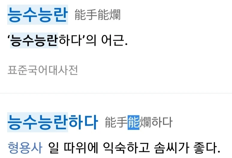 나름 능수능란했으나 어떤 부분은 더 보완해야겠단 마음으로 수업일기 쓰다 '능수능란 한자가 뭐지?' 능은 能(능할 능)이겠고 수는 왠지 手(손 수) 같습니다. 그럼 란은? 찾아보니 爛(빛날 란). 합치면 能手能爛, 일에 익숙하고 솜씨가 좋단 뜻이라고 합니다. 能은 잘하는 것, 爛은 난숙(爛熟 : 무르익음)에서 알 수 있듯 잘 익어 통달했단 말이겠습니다.