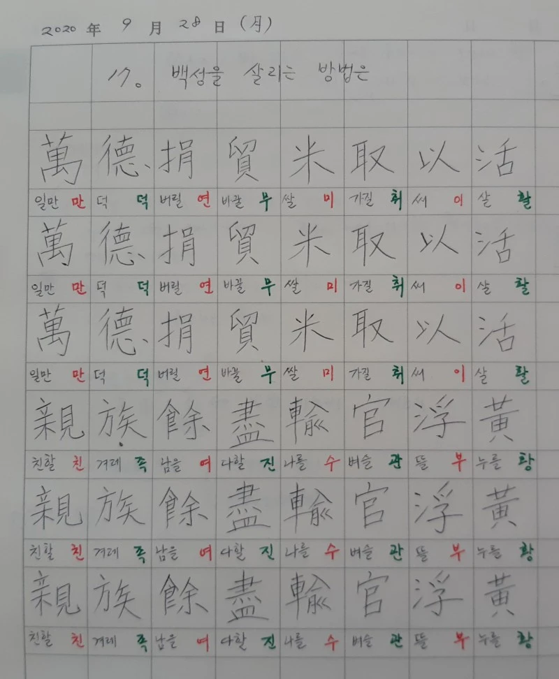 재작년 추석연휴 전날 2학년 등교수업. 원격수업 때 공부한 17과를 한자쓰기 학습활동지에 담아 나눠 주고 쓰게 했습니다. 45분 내내 쓰기만 하면 학생들이 지루해할 듯해 제갈량 <출사표> 펜글씨 ASMR 영상을 같이 틀었습니다.